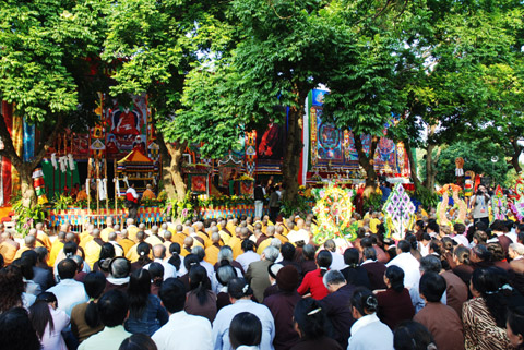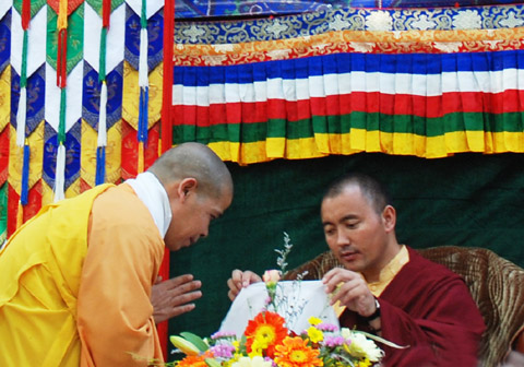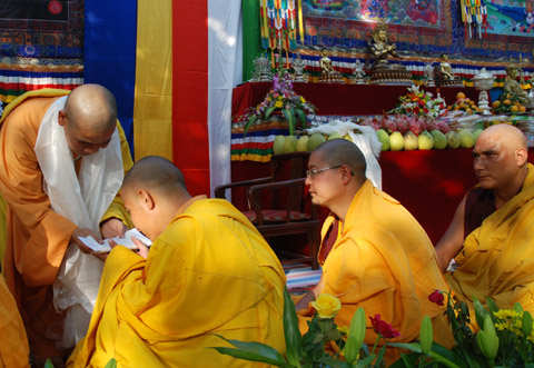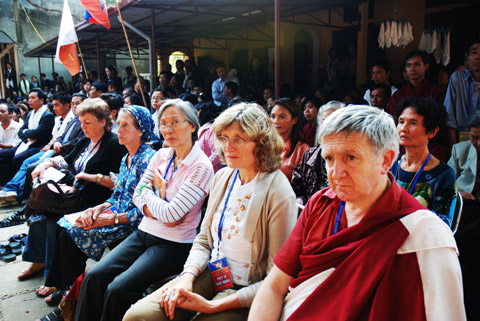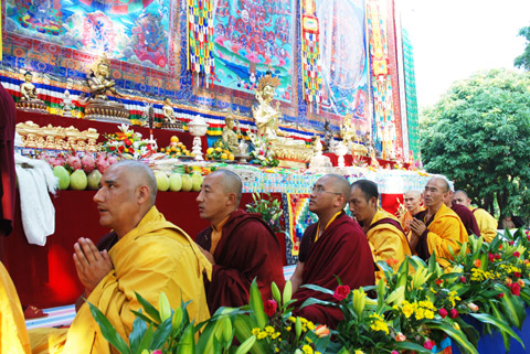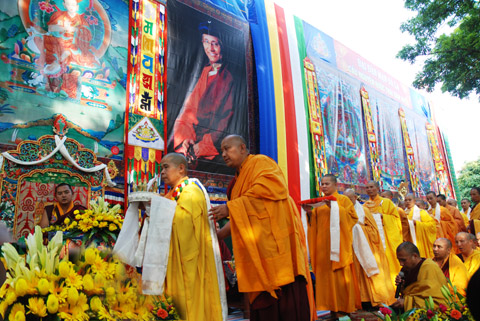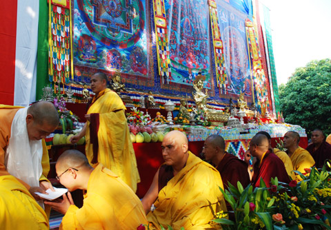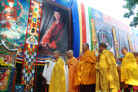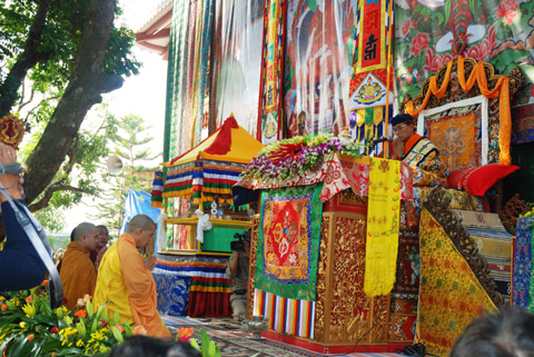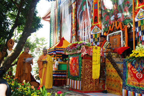 Đại đức Thích Minh Trí – Chánh thư ký BTS thành hội Phật giáo Hà Nội – trụ trì chùa Quang Ân tác bạch bày tỏ lòng kính ngưỡng đối với Đức Pháp Vương và các nhiếp chính Vương đã tới Việt nam lần thứ 2. Đại đức cùng chư tôn Đức tăng ni Sơn môn Hương Tích dâng phẩm vật cúng dường Mandala, lễ Phật cầu nguyện Quốc thái dân an.
