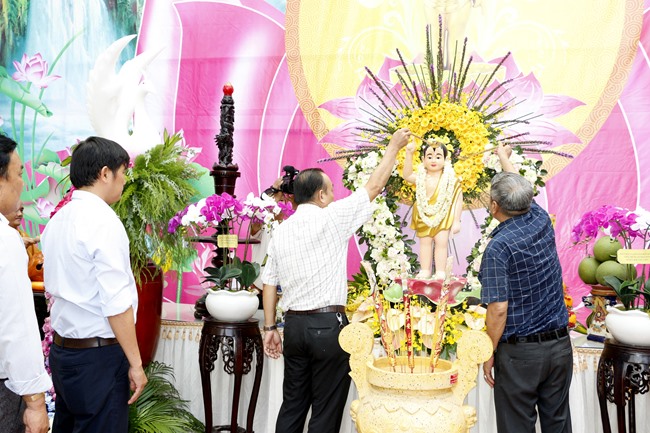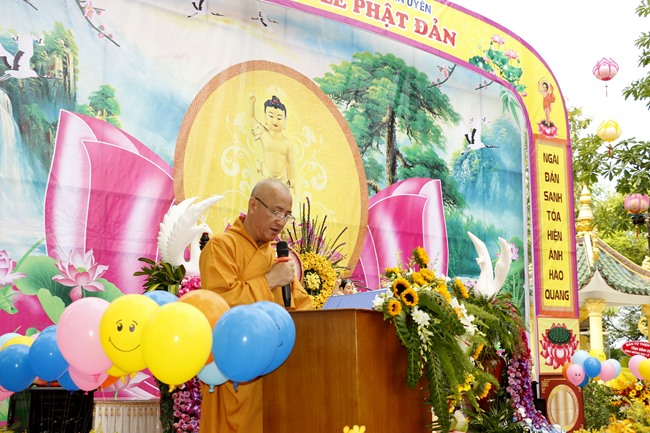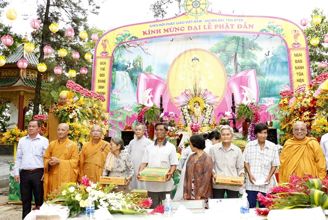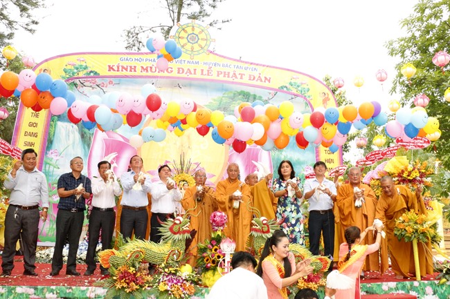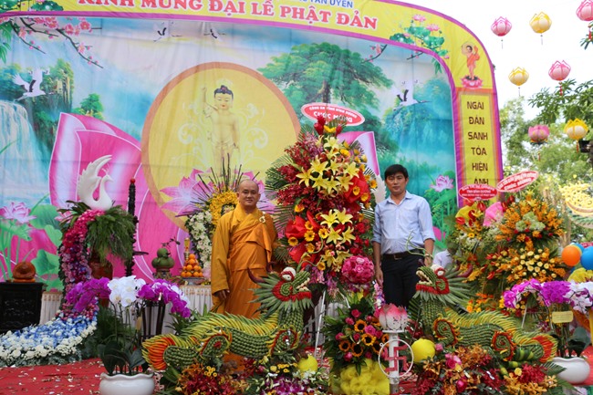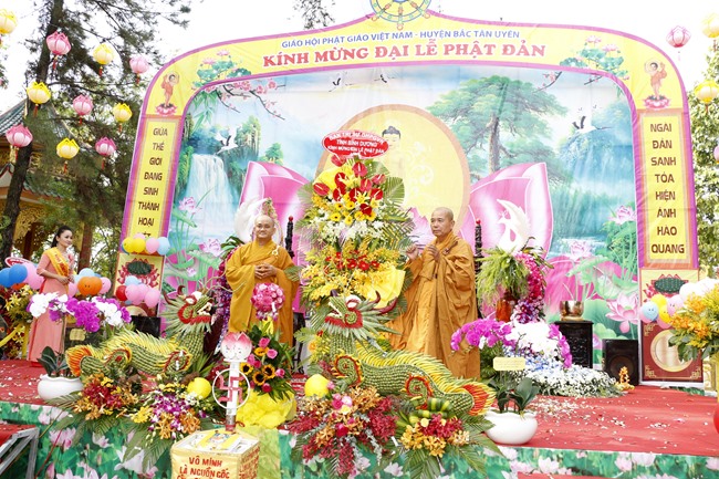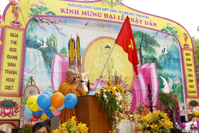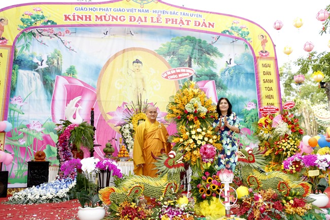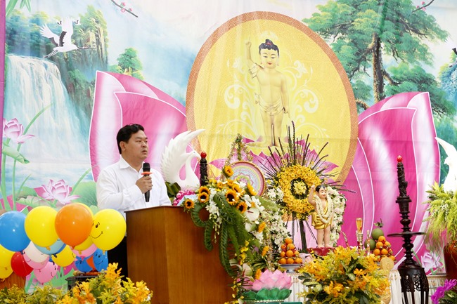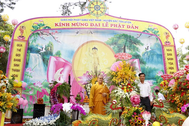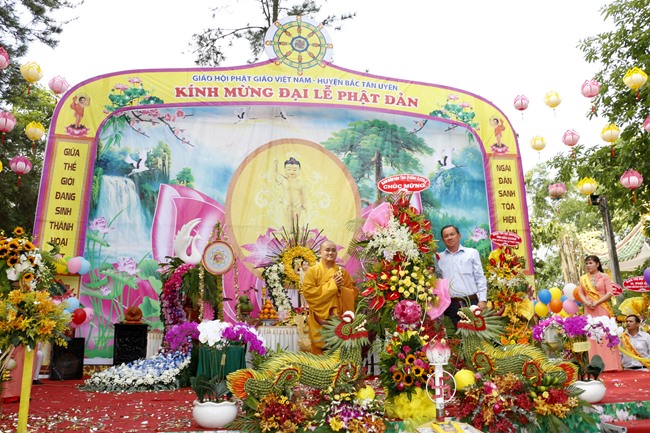 Thay mặt lãnh đạo huyện Bắc Tân Uyên, ông Trần Văn Phương, Phó Chủ tịch UBND huyện Bắc Tân Uyên đã hân hoan bày tỏ niềm vui nhân mùa Phật đản về, cũng là nhân kỷ niệm 128 năm ngày sinh Bác Hồ. Đồng thời, ông cũng phát biểu ghi nhận và đánh giá cao Phật giáo huyện nhà trong thời gian qua đã có những đóng góp tích cực trong các phong trào thi đua yêu nước, các cuộc vận động xây dựng nông thôn mới, các hoạt động an sinh xã hội… góp phần không nhỏ vào việc xây dựng quê hương đất nước. Phó Chủ tịch UBND huyện Bắc Tân Uyên ông Trần Văn Phương mong muốn các Tăng Ni, Phật tử quan tâm hơn nữa đến việc gìn giữ sự đoàn kết, thống nhất, tích cực thực hiện tốt tinh thần “phụng sự đạo pháp – phục vụ dân tộc”, đã có nhiều cố gắng trong thực hiện đường hướng hành đạo tiến bộ; tích cực hưởng ứng các phong trào, các cuộc vận động do chính quyền, MTTQ, đoàn thể phát động như hưởng ứng việc học tập và làm theo tư tưởng, đạo đức, phong cách Hồ Chí Minh góp phần cùng huyện nhà xây dựng một xã hội văn minh, hiện đại, nghĩa tình…