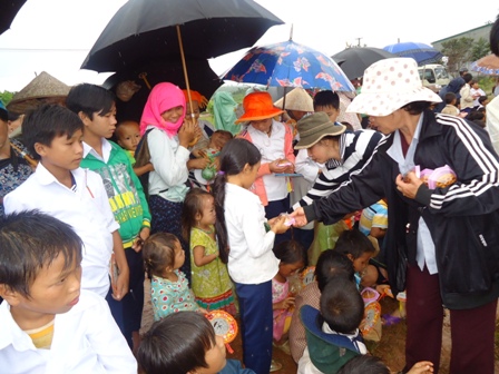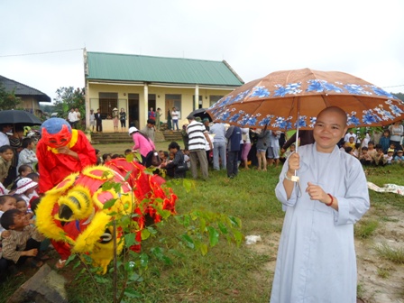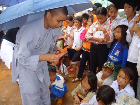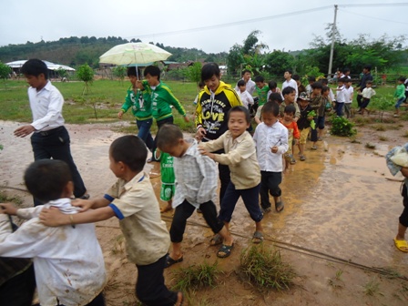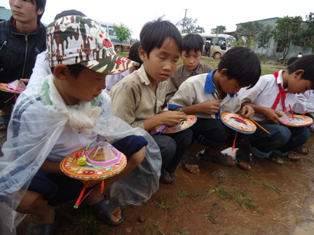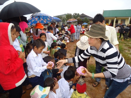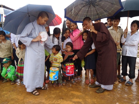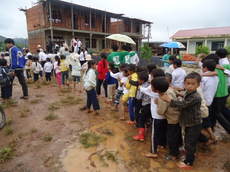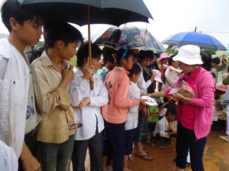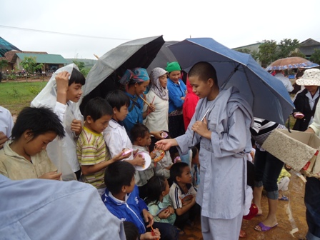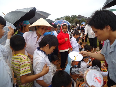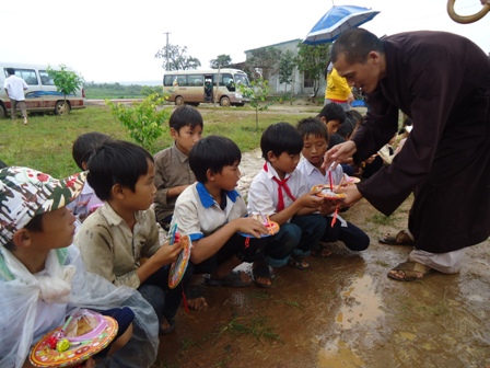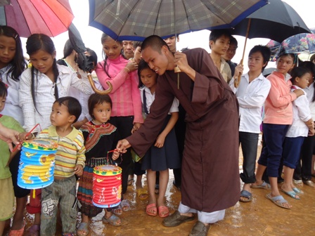 Thật xúc động trước cảnh trời mưa, sân trường lầy lội nhưng các em vẫn tập trung xếp vòng quanh trong sân trường để vui chơi và nhận bánh và lồng đèn từ phái đoàn Linh Quang tịnh xá (Q. 4, Tp. HCM)