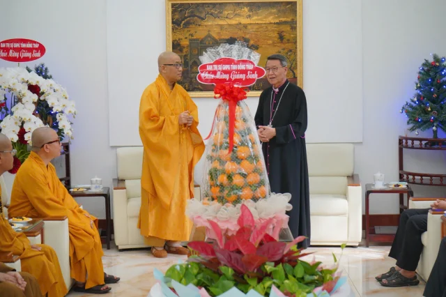 Chiều ngày 23/12/2025, trước thềm Lễ Giáng sinh, thừa ủy quyền của Thượng tọa Thích Tĩnh Triệt – Ủy viên HĐTS, Trưởng BTS GHPGVN tỉnh Đồng Tháp; Thượng tọa Thích Quảng Lộc – Ủy viên HĐTS, Phó trưởng Ban Thường trực BTS GHPGVN tỉnh, cùng chư Tôn đức đại diện Ban Thường trực BTS Phật giáo tỉnh đã đến chúc mừng chư vị Chức sắc, Chức việc, bà con đồng bào theo Công giáo tỉnh Đồng Tháp.