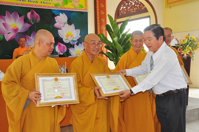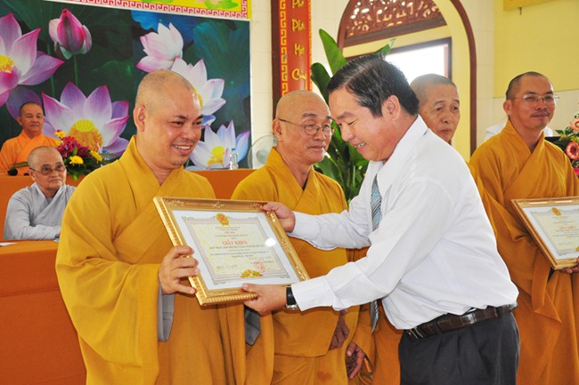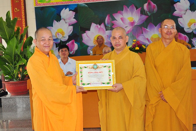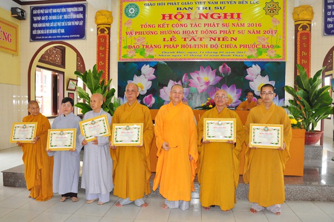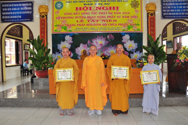 Cũng tại Hội nghị Hòa thượng Thích Minh Thiện, HT. Thích Thiện Tài đã trao tặng bằng tuyên dương công đức của tỉnh, huyện đến những cá nhân tập thể đã đóng góp thành tựu cho Phật sự trong năm.