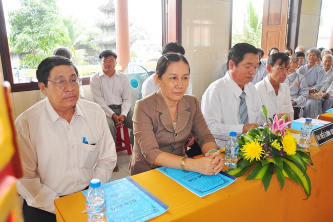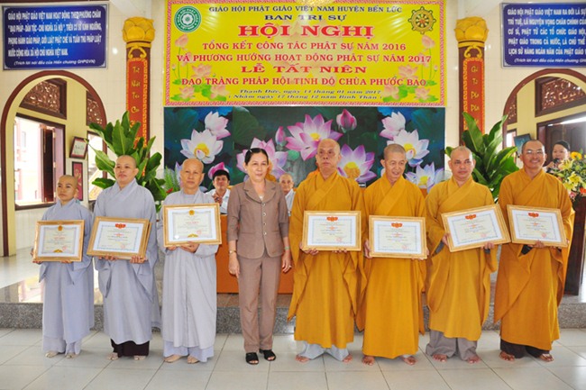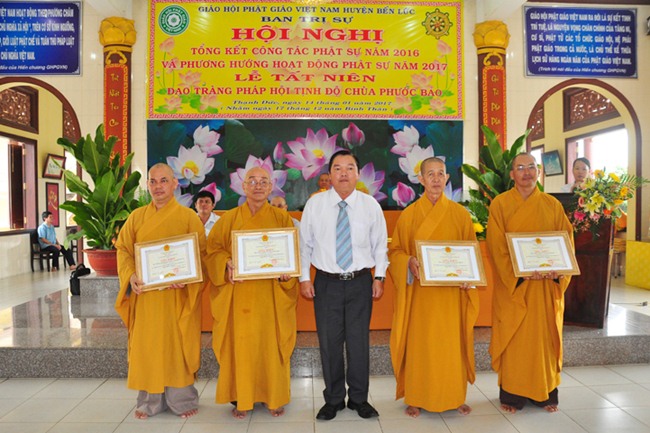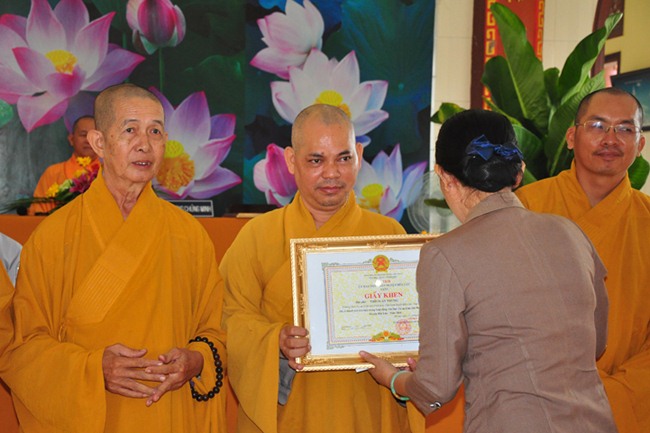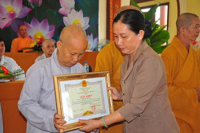 Chư tôn đức Tăng Ni và Phật tử cũng đón nhận bằng khen của HĐND, UBND,UBMTTQVN huyện Bến Lức do Ông Trần Hoàng Nhân, bà Võ Thị Thu trao tặng