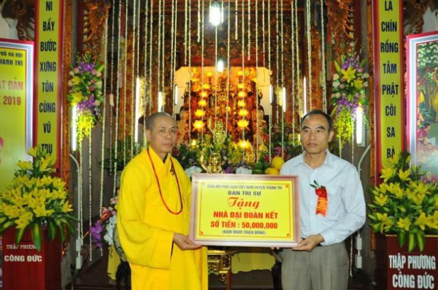 Nhân dịp này, hiện thực hóa tinh thần từ bi của đạo Phật và “lá lành đùm lá rách” của dân tộc Việt, BTS GHPGVN huyện Thanh Trì đã trao tặng tới các hộ nghèo trong địa bàn huyện với tổng trị giá 50 triệu đồng để hỗ trợ xây dựng nhà đại đoàn kết, nhà tình nghĩa, với mong muốn sẻ chia phần nào với nỗi khó khăn vất vả của những gia đình nghèo khổ, đồng thời mong họ có thêm động lực vươn lên trong cuộc sống.