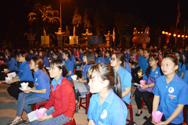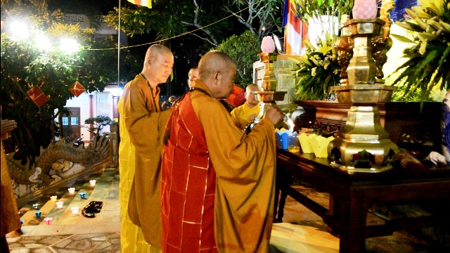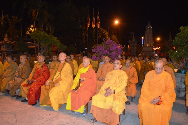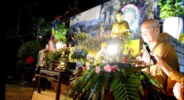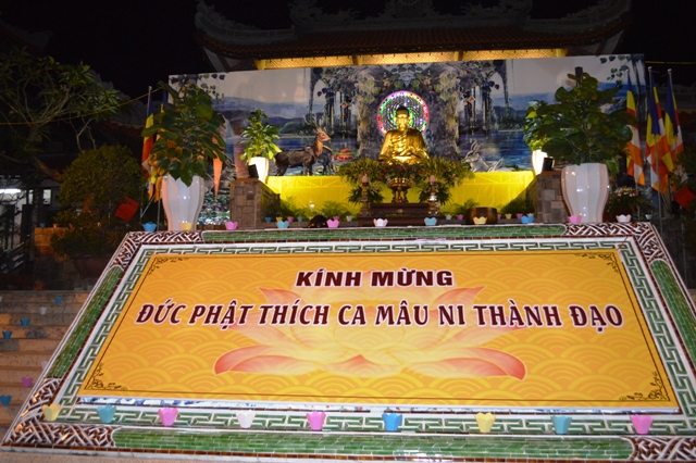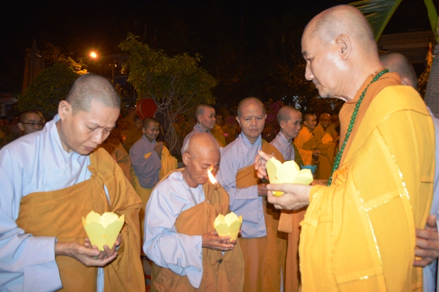 Tiếp theo là nghi thức thắp nến và truyền đăng tri ân Đức Từ phụ Thích Ca Mâu Ni Phật, hàng ngàn ngọn nến tri ân được thắp sáng khắp lễ trường tháp Hòa Bình – chùa sắc tứ Long Sơn và đại chúng đồng tụng bài “Sám Phật thành đạo” cùng lời nguyện cầu quốc thái dân an, thế giới hòa bình, nhân dân an lạc.