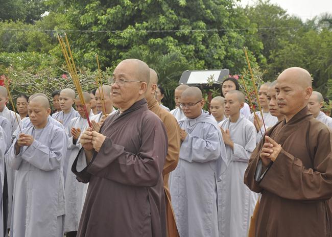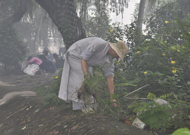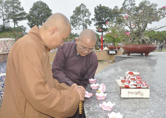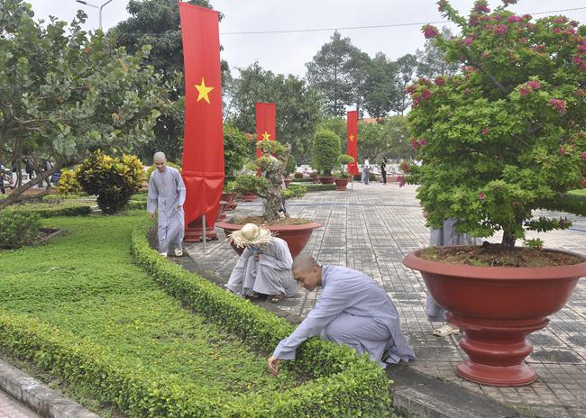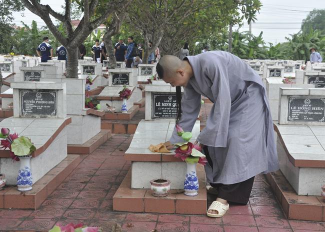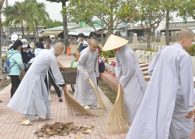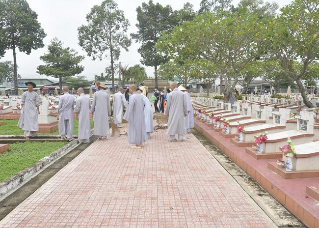 Sau nghi thức dâng hương tưởng niệm chư anh linh anh hùng liệt sĩ-người đã ngã xuống vì đại nghĩa dân tộc, gìn giữ cho quê hương Việt Nam được yên bình, hạnh phúc- Tăng Ni sinh và quý nam nữ Phật tử quét dọn, làm sạch phần mộ, khuông viên nghĩa trang liệt sĩ tỉnh Long An.