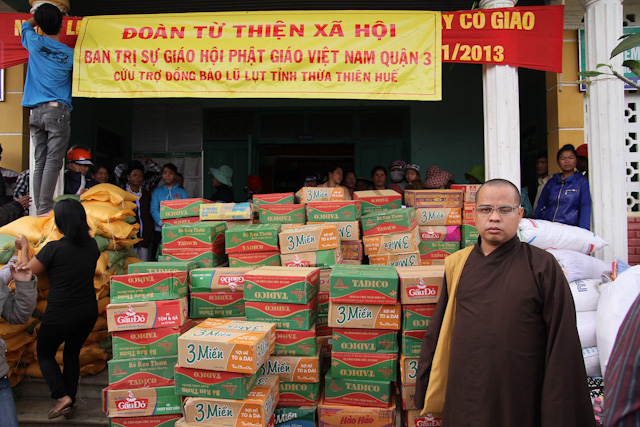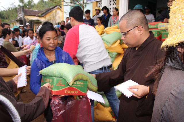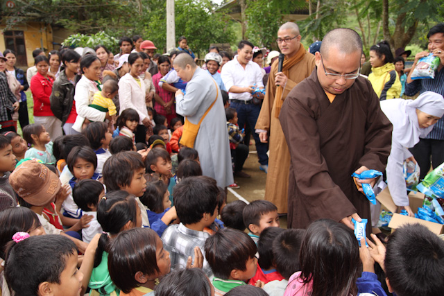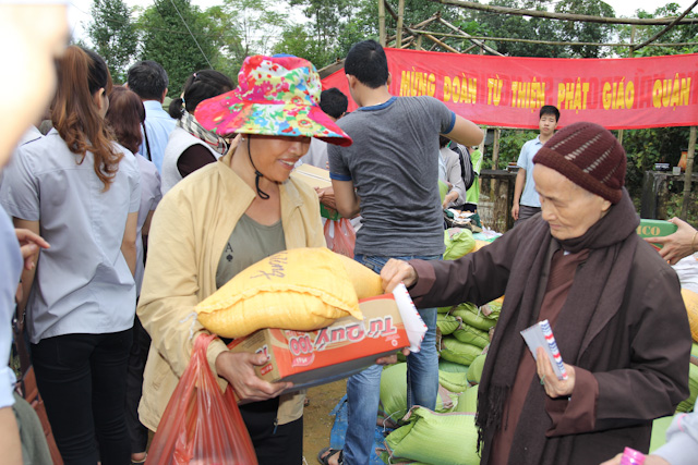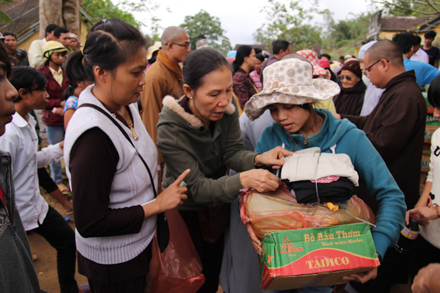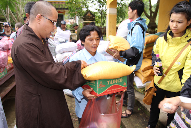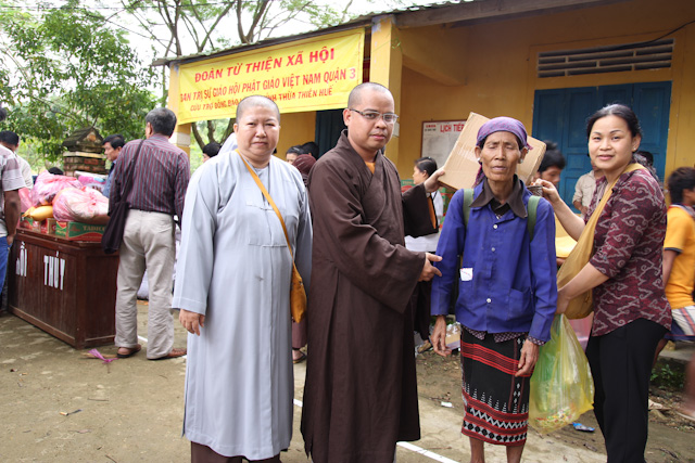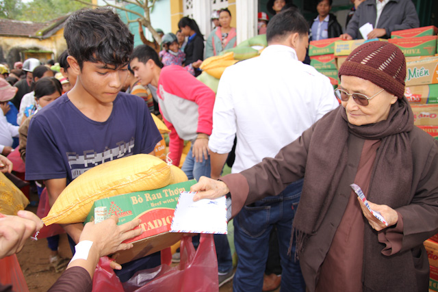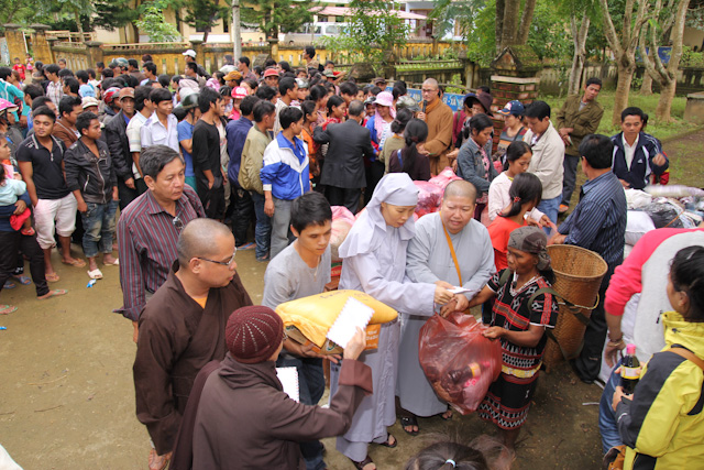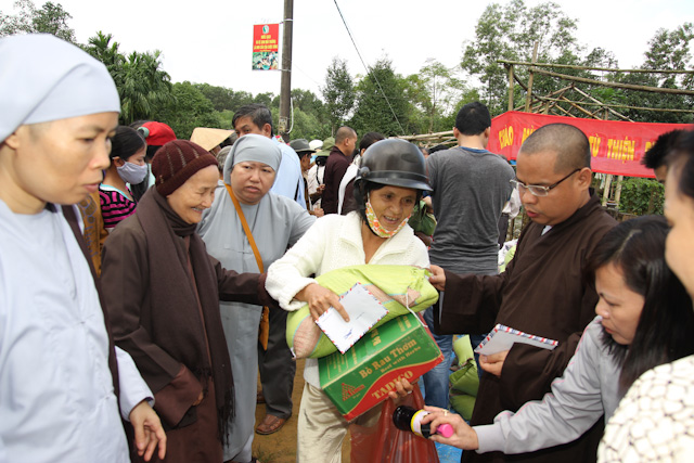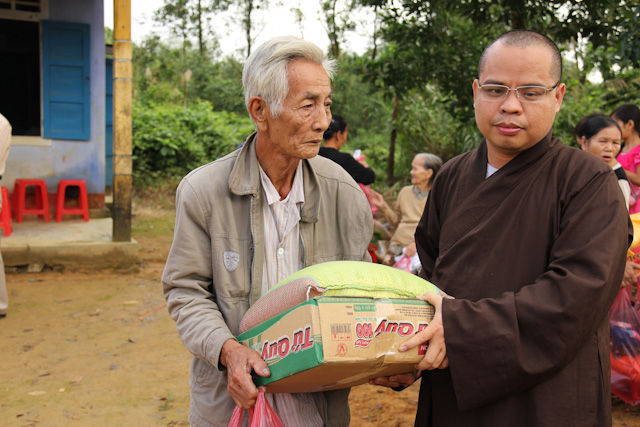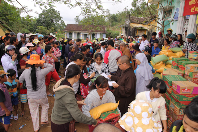 Chư Tôn đức và quý Phật tử đã dành nhiều thời gian quý báu, vượt cả ngàn cây số để về thăm và tặng quà tại huyện vùng sâu vùng xa A Lưới với số tịnh tài, tịnh vật tổng trị giá hơn 300.000.000vnđ tại xã Hồng Thủy (200 phần); xã Hồng Quảng (200 phần), huyện A Lưới và tại thôn Bình Thuận – xã Bình Điền (200 phần) dưới sự hướng dẫn của Thượng tọa Thích Tịnh Quang, Ủy viên TT Ban Kiểm Soát TƯ, Trưởng Ban Kiểm Soát GHPGVN tỉnh TT. Huế. Mỗi phần quà phái đoàn trao tặng đến với bà con dân tộc thiểu số nơi đây trị giá hơn 500. 000đ, nhằm chia sẻ nổi khó khăn vất vả với đồng bào vùng cao đang chịu ảnh hưởng của các cơn bão số 8,9,10,11 và 14 vừa qua.
