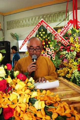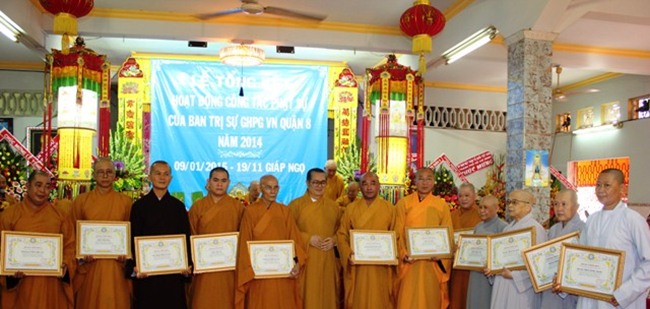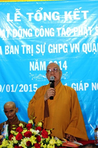 Phát biểu tại buổi lễ tổng kết, ông Trần Quang Thảo-Phó Bí thư Quận ủy Quận 8 ghi nhận những đóng góp trong công tác từ thiện xãhội của Phật giáo Quận 8 cho đồng bào nghèo trong quận. Tại buổi lễ, ông cũng trình bày đời sống của người dân, tình hình an ninh trật tự trong địa bàn quận, ông cho biết quận 8 là một trong 24 Quận Huyện trong thành phố có số hộ dân nghèo chỉ đứng trên huyện Nhà Bè. Dịp Tết Ất Mùi 2015 này, chính quyền quận 8 vận động 3 tỷ đồng để chăm lo cho 4500 hộ dân nghèo đón Tết. Vì vậy, ông kêu gọi Phật giáo Quận 8 tiếp tục hưởng ứng phong trào gây quỹ chăm lo cho dân nghèo trong quận đón Tết.