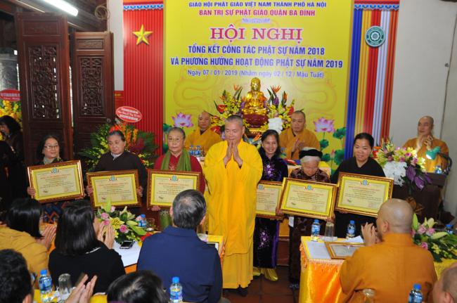 Nhân dịp này, BTS GHPGVN quận Ba Đình đã trao tặng bằng tuyên dương công đức tới các Phật tử tiêu biểu và các đạo tràng đại diện cho 12 chùa trên địa bàn quận, động viên tinh thần tu tập và ghi nhận những cống hiến nhằm xiển dương giáo pháp Phật đà, xây dựng cuộc sống tốt đẹp của các đạo tràng trong năm 2018.