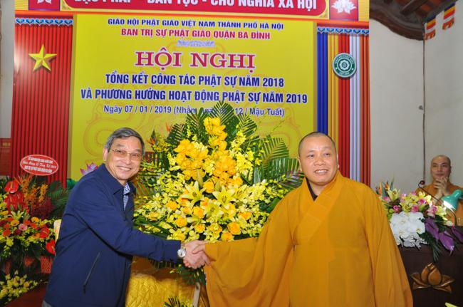 Tại buổi lễ, ông Nguyễn Quang Trung – Ủy viên thường vụ, Phó chủ tịch UBND quận Ba Đình đã có lời phát biểu chúc mừng những thành quả đã đạt được trong năm vừa qua của Tăng Ni và Phật tử quận Ba Đình. Ông nhận thấy, so với năm trước, năm 2018 này việc phân công từng công việc cụ thể giữa các thành viên BTS đã rõ ràng hơn, hoạt động đều hơn, nhất là việc phối hợp giữa BTS và các chùa với các địa phương. Qua bản báo cáo của sư thầy Thích Đàm Trà, có thể thấy được sự đoàn kết nội bộ và giúp đỡ nhau trong các hoạt động Phật sự của các cơ sở tự viện trên địa bàn quận cũng đã có những bước phát triển mới. Ông cũng mong rằng với phương châm “Đạo pháp – Dân tộc – chủ nghĩa xã hội”, BTS nói chung và các Tăng Ni Phật tử trên địa bàn quận nói riêng “mỗi người hãy đóng góp một chút tâm, trí tuệ, sức lực vào việc thực hiện những nghĩa cử trong hoạt động ở địa phương. Với trách nhiệm của BTS Phật giáo, chúng tôi cũng rất mong muốn hãy phát huy kế thừa những kết quả của năm 2018 để chúng ta vừa đào tạo, vừa bồi dưỡng được những đội ngũ trẻ hơn, có năng lực hơn để làm tốt và xuất sắc hơn những hoạt động Phật sự trong và ngoài quận. Hãy phát huy truyền thống, văn hóa đặc sắc của dân tộc ta. Đặc biệt, các Phật tử hãy chấp hành tốt những chủ trương chính sách của Đảng, Nhà nước và Giáo hội; xây dựng khối đại đoàn kết toàn dân, cùng góp công sức để ủng hộ những cuộc vận động toàn dân đoàn kết xây dựng đời sống văn hóa. Mong quý Tăng Ni hãy nêu cao hạnh nguyện từ bi của đạo Phật, hỗ trợ giúp đỡ những hoàn cảnh khó khăn trong cuộc sống, chung tay cùng xây dựng xã hội tốt đẹp, hạnh phúc”.