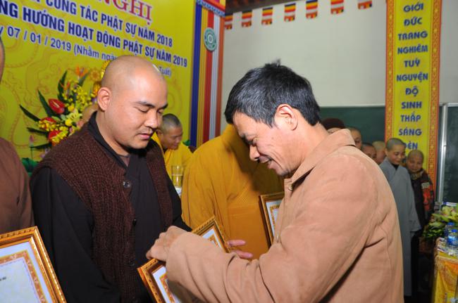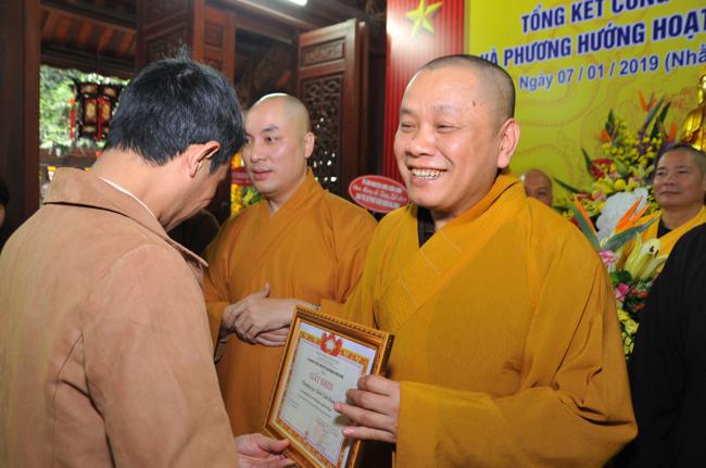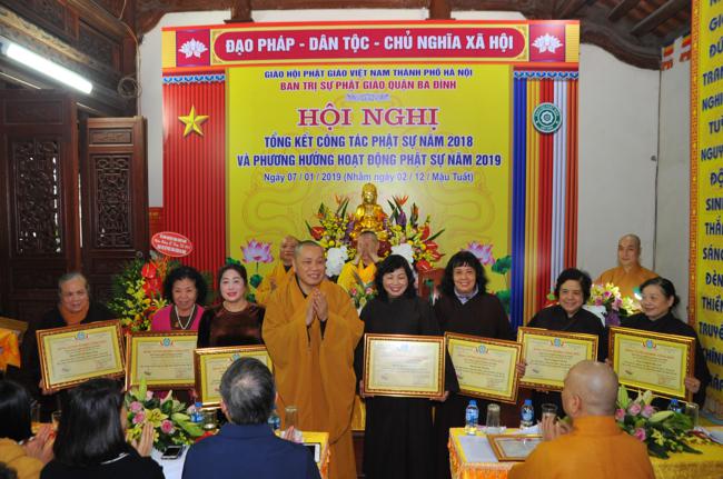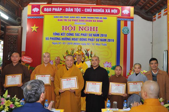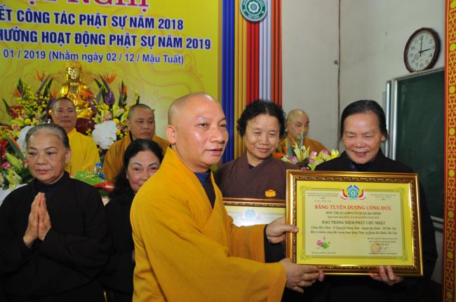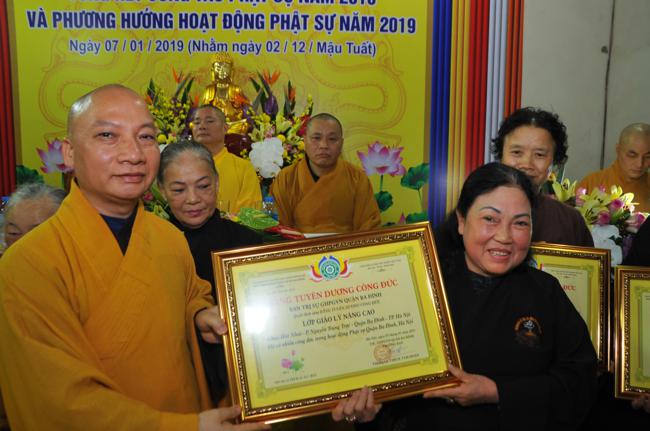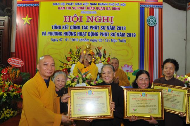 Nhân dịp này, BTS GHPGVN quận Ba Đình đã trao tặng bằng tuyên dương công đức tới các Phật tử tiêu biểu và các đạo tràng đại diện cho 12 chùa trên địa bàn quận, động viên tinh thần tu tập và ghi nhận những cống hiến nhằm xiển dương giáo pháp Phật đà, xây dựng cuộc sống tốt đẹp của các đạo tràng trong năm 2018.