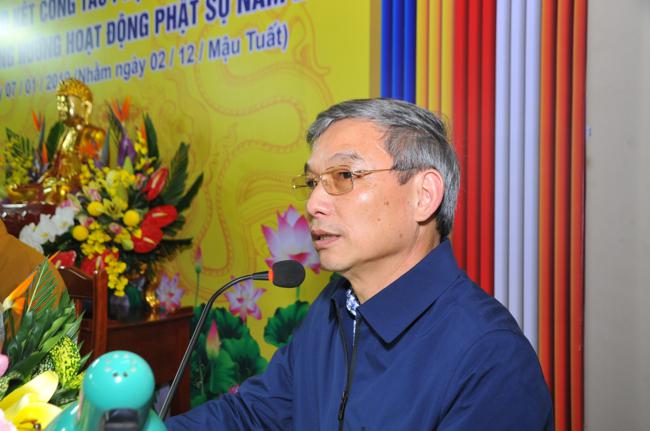 Tại buổi lễ, ông Nguyễn Quang Trung – Ủy viên thường vụ, Phó chủ tịch UBND quận Ba Đình đã có lời phát biểu chúc mừng những thành quả đã đạt được trong năm vừa qua của Tăng Ni và Phật tử quận Ba Đình. Ông nhận thấy, so với năm trước, năm 2018 này việc phân công từng công việc cụ thể giữa các thành viên BTS đã rõ ràng hơn, hoạt động đều hơn, nhất là việc phối hợp giữa BTS và các chùa với các địa phương. Qua bản báo cáo của sư thầy Thích Đàm Trà, có thể thấy được sự đoàn kết nội bộ và giúp đỡ nhau trong các hoạt động Phật sự của các cơ sở tự viện trên địa bàn quận cũng đã có những bước phát triển mới. Ông cũng mong rằng với phương châm “Đạo pháp – Dân tộc – chủ nghĩa xã hội”, BTS nói chung và các Tăng Ni Phật tử trên địa bàn quận nói riêng “mỗi người hãy đóng góp một chút tâm, trí tuệ, sức lực vào việc thực hiện những nghĩa cử trong hoạt động ở địa phương. Với trách nhiệm của BTS Phật giáo, chúng tôi cũng rất mong muốn hãy phát huy kế thừa những kết quả của năm 2018 để chúng ta vừa đào tạo, vừa bồi dưỡng được những đội ngũ trẻ hơn, có năng lực hơn để làm tốt và xuất sắc hơn những hoạt động Phật sự trong và ngoài quận. Hãy phát huy truyền thống, văn hóa đặc sắc của dân tộc ta. Đặc biệt, các Phật tử hãy chấp hành tốt những chủ trương chính sách của Đảng, Nhà nước và Giáo hội; xây dựng khối đại đoàn kết toàn dân, cùng góp công sức để ủng hộ những cuộc vận động toàn dân đoàn kết xây dựng đời sống văn hóa. Mong quý Tăng Ni hãy nêu cao hạnh nguyện từ bi của đạo Phật, hỗ trợ giúp đỡ những hoàn cảnh khó khăn trong cuộc sống, chung tay cùng xây dựng xã hội tốt đẹp, hạnh phúc”.