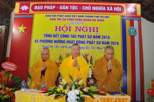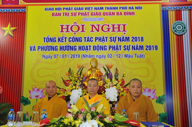 Mở đầu hội nghị, Thượng tọa Thích Tâm Hoan đã phát biểu khai mạc, nhấn mạnh vai trò trọng tâm của hội nghị lần này đó là “kiểm điểm, đánh giá những kết quả đạt được về công tác Phật sự. Trong năm qua BTS GHPGVN quận Ba Đình cùng toàn thể Tăng Ni, Phật tử đã không ngừng nỗ lực phấn đấu, hoàn thành kế hoạch công tác Phật sự trên tất cả các lĩnh vực. Năm 2018 đã khép lại với những kết quả tốt đẹp đạt được trong hoạt động Phật sự của Phật giáo quận Ba Đình đã đóng góp hữu hiệu vào sự nghiệp chung của Phật giáo thủ đô và sự nghiệp phát triển kinh tế xã hội của thành phố Hà Nội và quận Ba Đình. Bước sang năm 2019 trong bối cảnh kinh tế xã hội của đất nước còn nhiều khó khăn, các hoạt động Phật sự cũng gặp không ít trở ngại, nhưng tôi tin tưởng rằng với tinh thần đoàn kết hòa hợp, với trí tuệ sáng suốt của tập thể, chư tôn thiền đức Tăng Ni sẽ có những nhận định chính xác, những ý kiến giải pháp đúng đắn, nhằm phát huy những thành quả đã đạt được, tháo gỡ khó khăn, khắc phục tồn tại để triển khai chương trình hoạt động Phật sự theo chỉ đạo của Phật giáo thành phố Hà Nội, tạo ra những thành quả tốt đẹp hơn nữa”.