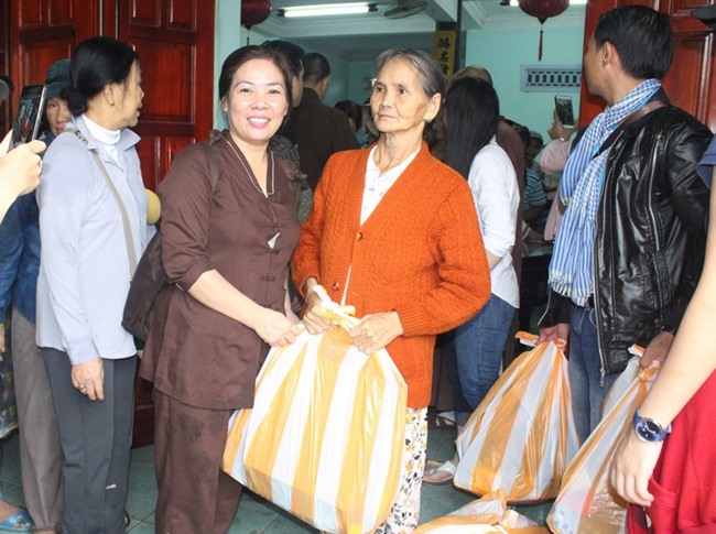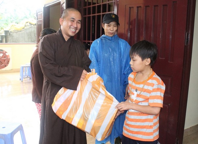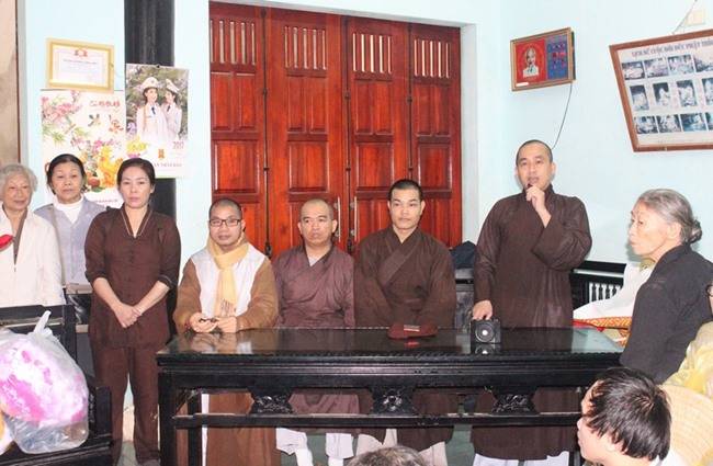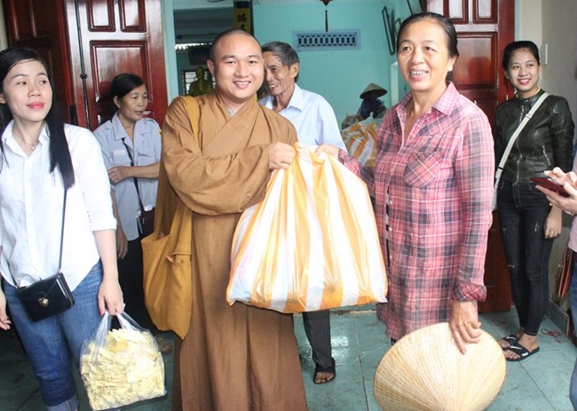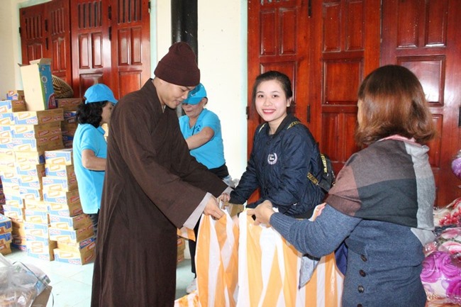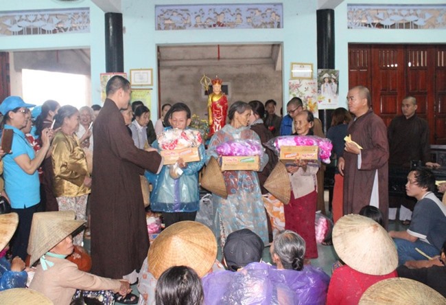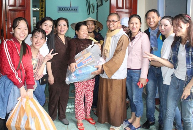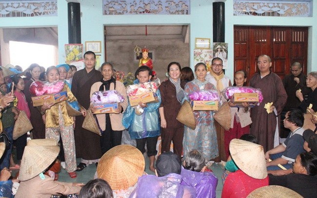 ĐĐ.Thích Viên Quán, Phó thư ký kiêm Chánh VP BTS PG tỉnh thay mặt đoàn chia sẻ và động viên, thăm hỏi, khích lệ tinh thần của bà con tại địa phương. Mỗi phần quà 200 nghìn đồng bao gồm: 1 thùng mì gói, mền, nước sạch, các nhu yếu phẩm… Tổng trị giá 60 triệu đồng.