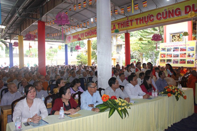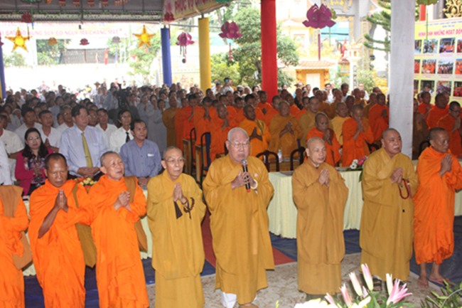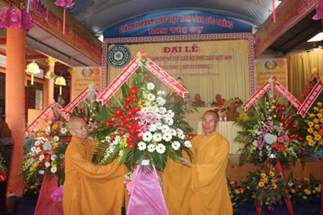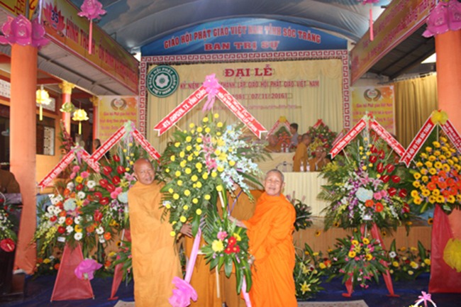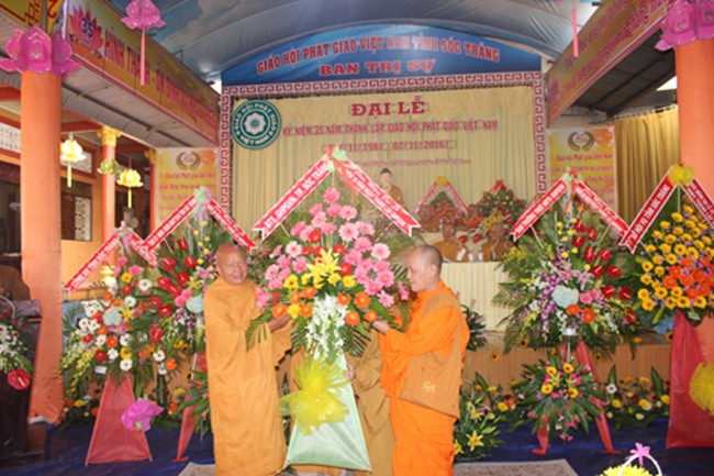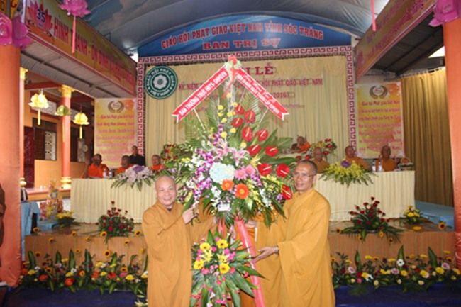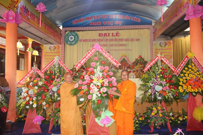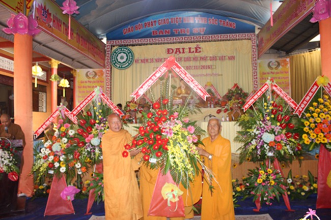 Chư Tôn đức Tăng ni đại diện các hệ phái thuộc 182 ngôi tự viện trong tỉnh Sóc Trăng và đông đảo Phật tử tại địa phương đồng chứng dự, tặng nhiều lẵng hoa chúc mừng Đại lễ kỷ niệm 35 năm thành lập Giáo hội Phật giáo Việt Nam.