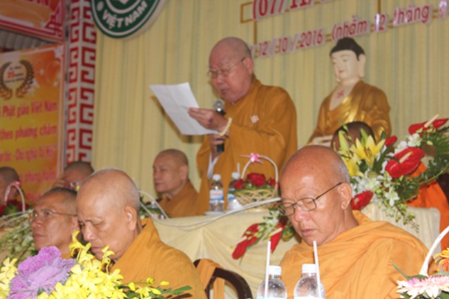 Thượng tọa Thích Minh Hạnh báo cáo kết quả đạt được của Ban Trị sự GHPGVN tỉnh Sóc Trăng từ khi tái thành lập cho đến nay 1992 – 2016; 24 năm hình thành và phát triển, luôn luôn đoàn kết hòa hợp trong mọi công tác Phật sự với phương châm “Đạo pháp – Dân tộc – Chủ nghĩa xã hội”.