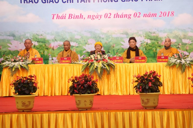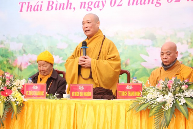 Đạo từ của HT.Thích Bảo Nghiêm – tán thán công đức của BTS GHPGVN tỉnh Thái Bình, nhắc nhở mỗi Tăng Ni cần noi gương các bậc tiền bối, luôn “đoàn kết hòa hợp, trưởng dưỡng đạo tâm, trang nghiêm giáo hội”, tinh tấn tu hành, đưa Phật giáo Thái Bình phát triển vững mạnh. Hòa thượng cũng chúc mừng những thành tựu của Phật giáo Thái Bình và tin tưởng các vị được tấn phong giáo phẩm sẽ phát huy tinh thần gương mẫu để các hàng hậu học noi theo và gửi lời chúc Tết đến chư tôn đức Tăng Ni và đại biểu tham dự.