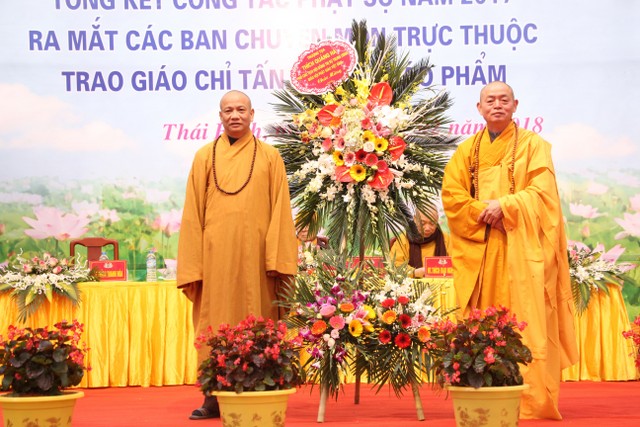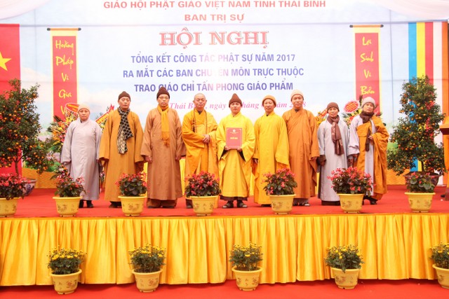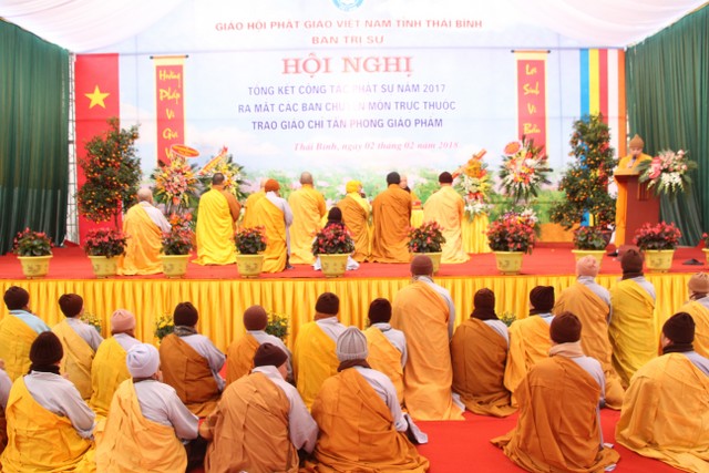 Thay mặt thường trực BTS, ĐĐ.Thích Thanh Ân, Chánh Thư ký BTS Phật giáo tỉnh đã đọc quyết định chuẩn y nhân sự các ban ngành chuyên môn BTS GHPGVN tỉnh Thái Bình và công bố quyết định tấn phong giáo phẩm.