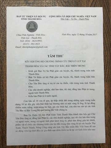 Dưới đây là toàn văn Tâm Thư kêu gọi của Ban Từ Thiện Xã Hội Phật Giáo Tỉnh Thanh Hóa: