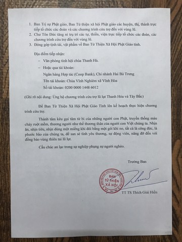 Ban Từ Thiện Xã Hội Phật Giáo Tỉnh Thanh Hóa thành tâm kêu gọi Chư Tôn Đức tăng ni, đồng bào Phật tử, các nhà doanh nghiệp, quý thí chủ hảo tâm trong và ngoài nước, trong và ngoài tỉnh phát khởi lòng từ, phát tâm đóng góp tài chính, phẩm vật tổ chức các chương trình cứu trợ đến trung tâm vùng lũ tại các huyện Thọ Xuân, Thạch Thành, Nông Cống cùng các tỉnh Tây Bắc miền Bắc Việt Nam để san sẻ, động viên kịp thời đến các gia đình nạn nhân thiên tai lũ lụt với hình thức như sau:
