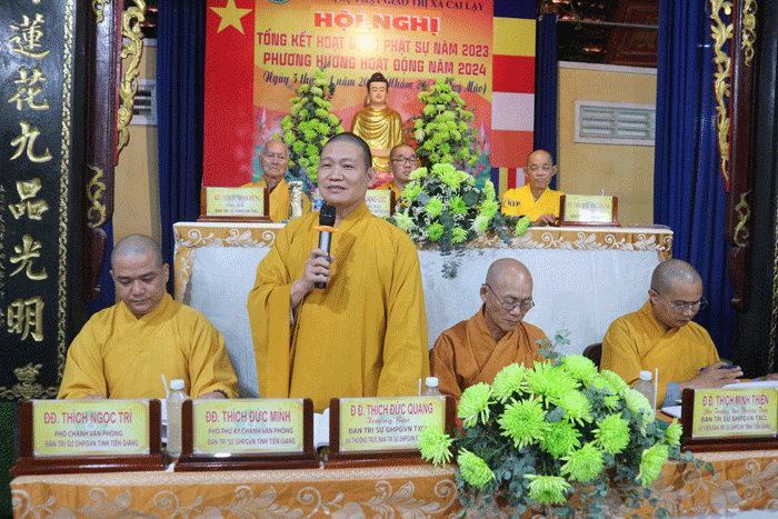 Phát biểu khai mạc, ĐĐ.Thích Đức Quang – UV TT BTS GHPGVN tỉnh, Trưởng ban BTS Phật giáo TX.Cai Lậy cho biết, trong năm 2023, mặc dù những thành quả đạt được có phần hạn chế nhưng BTS Phật giáo thị xã đã vận dụng tinh thần đoàn kết, hòa hợp nên Tăng Ni, Phật tử tín đồ ngày càng phát huy sứ mệnh phụng sự Đạo pháp và Dân tộc trên nhiều phương diện, đặc biệt là chính quyền các cấp vẫn luôn tạo điều kiện thuận lợi nhất có thể giúp BTS Phật giáo thị xã hoàn thành tốt nhiệm vụ của mình.