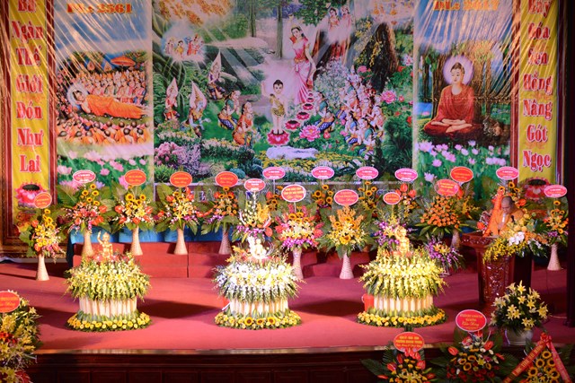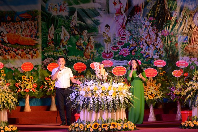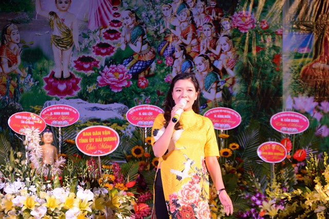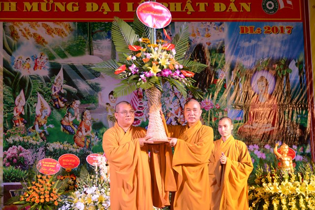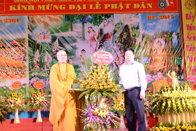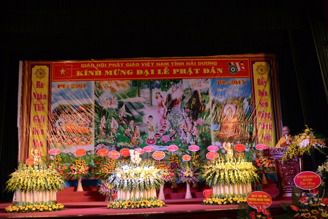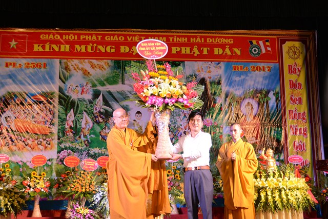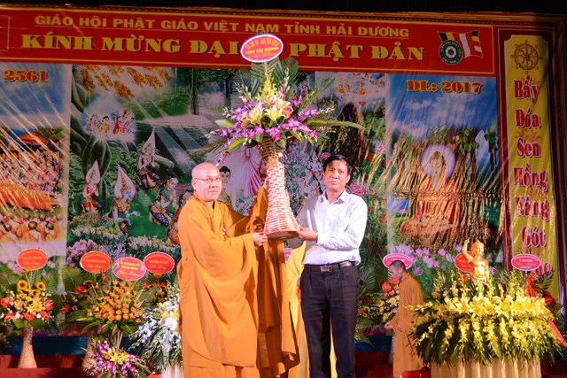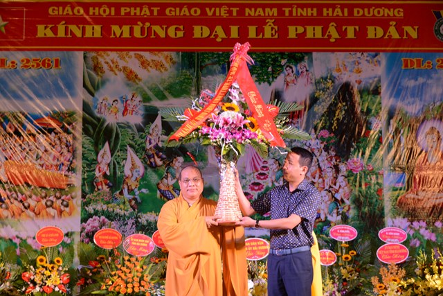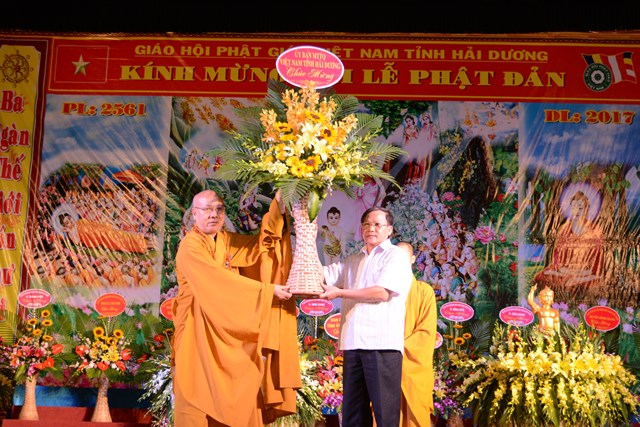 Nhân dịp này, Ban trị sự GHPGVN tỉnh Hải Dương đã đón nhận những lẵng hoa chúc mừng của các cấp chính quyền tỉnh Hải Dương, thành phố Hải Dương và Ban trị sự các huyện, thành phố trao tặng trong không khí hoan kỷ kính mừng Đức Phật Thích Ca Mâu Ni ra đời.