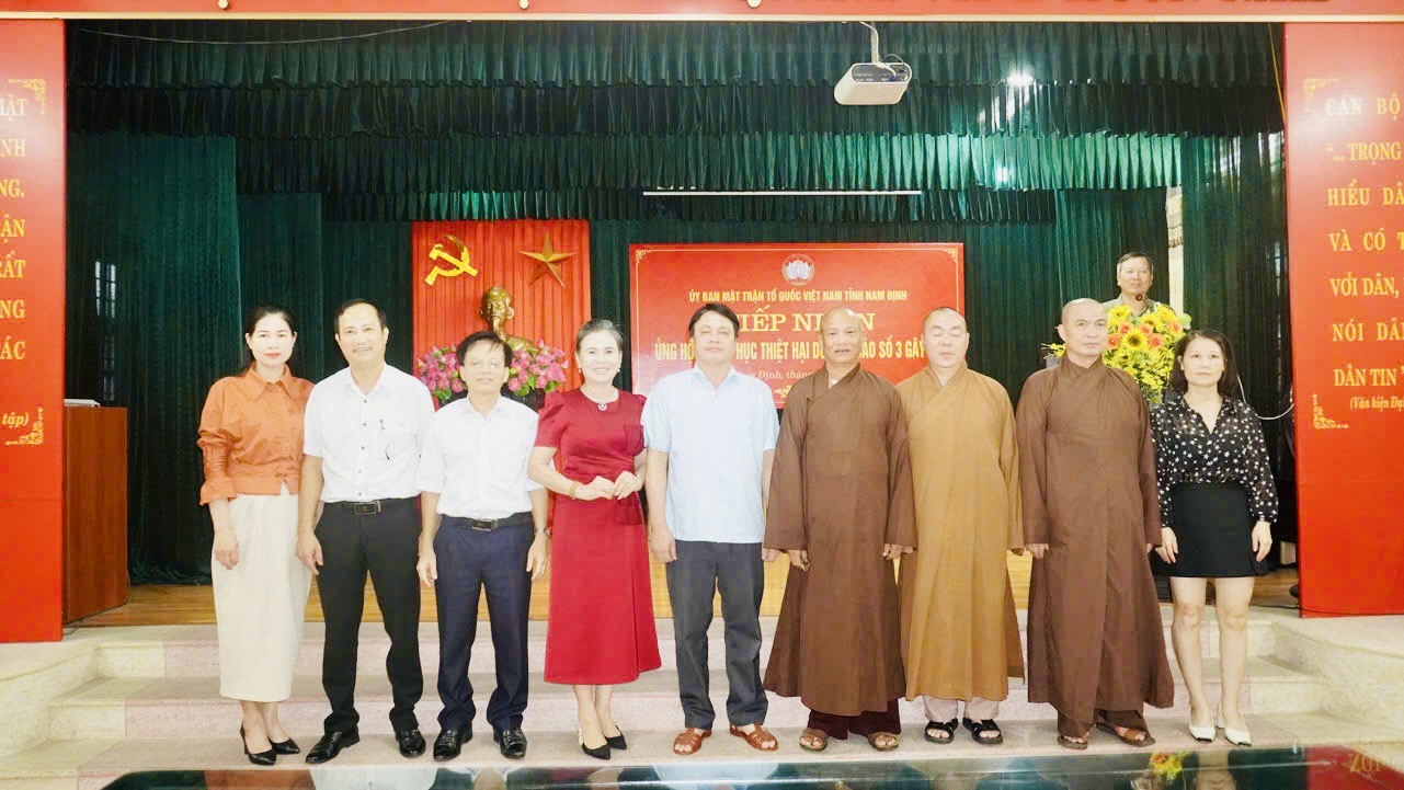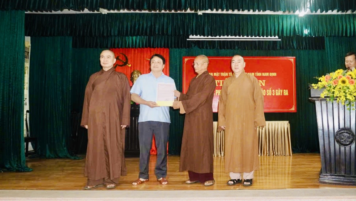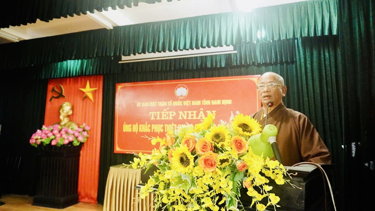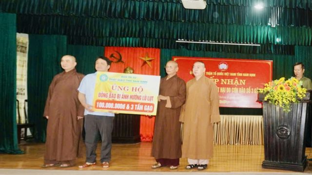 Theo đó, sáng nay ngày 12-09-2024 Hoà thượng Thích Quảng Hà – Phó Chủ tịch Hội đồng Trị sự, Trưởng Ban Trị sự GHPGVN tỉnh Nam Định, Trường BTS GHPGVN huyện Ý Yên; Thượng toạ Thích Thanh Huy – Phó ban Kinh tế Tài chính TƯ (KTTC TƯ), Trưởng ban KTTC PG tinh Nam Định, Trưởng Ban Trị sự GHPGVN huyện Vụ Bản; TT. Thích Giác Vũ – Chánh Thư ký BTS GHPGVN tỉnh Nam Định, Trưởng BTS Phật giáo TP. Nam Định, đã đại diện cho Tăng-ni tỉnh Nam Định trao 100 triệu đồng và 3 tấn gạo tại trụ sở UBMTTQVN tỉnh số 2 Phố Máy Tơ TP. Nam Định. Theo kế hoạch của Giáo hội số tiền và gạo trên đây là bước đầu (lần thứ 1) và vẫn còn tiếp tục chung tay, vận động…
