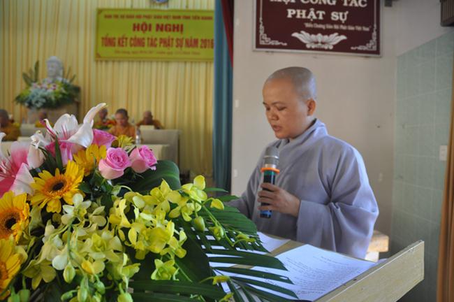 – Tại Hội nghị, Sư cô Thích nữ Diệu Tâm thay mặt Thư ký Văn phòng Ban Trị Sự đọc bản Báo Cáo Tổng Kết các công tác Phật sự năm 2016. Và trình bày Dự thảo Phương hướng hoạt động năm 2017.