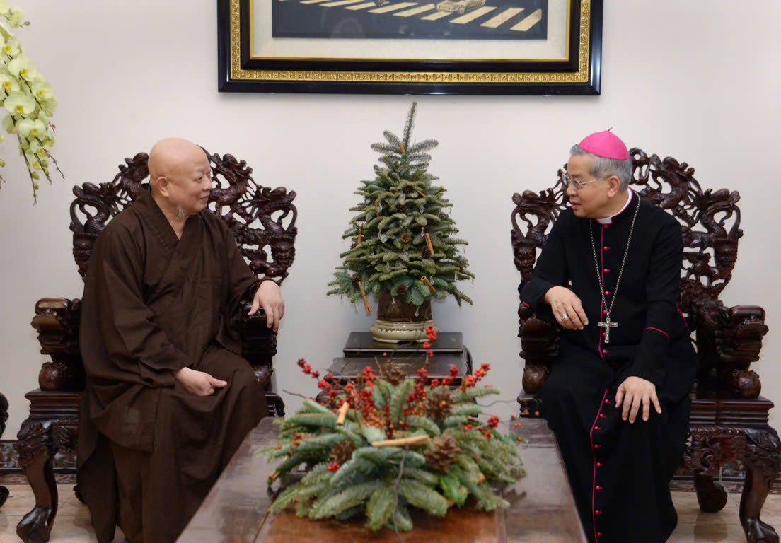 Tại buổi gặp gỡ, thay mặt Ban Trị sự GHPGVN TP.HCM, Hòa thượng Thích Lệ Trang đã gửi lời thăm hỏi và chúc mừng đến Đức Tổng Giám mục Giuse Nguyễn Năng, quý chức sắc và đồng bào Công giáo tại TP.HCM một mùa Giáng sinh an lành, bình an và nhiều niềm vui.