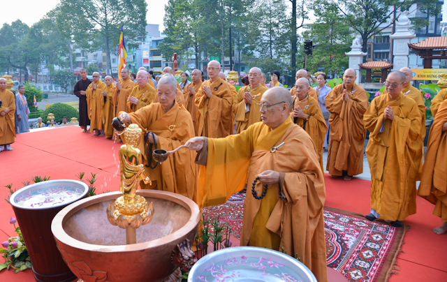Tại buổi lễ, Sau nghi thức niêm hương lễ Phật, TT.Thích Lệ Trang – Phó Ban trị sự kiêm trưởng Nghi lễ PG TP.HCM dẫn lễ để đại chúng cùng tụng kinh khánh đản kinh mừng Đức Từ Phụ Thích Ca Mâu Ni thị hiện. Tiếp theo, Hòa thượng phó Pháp Chủ trang nghiêm làm Lễ Tắm Phật, và hướng dẫn Tăng, Ni, Phật tử cùng làm lễ.