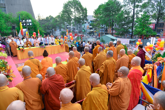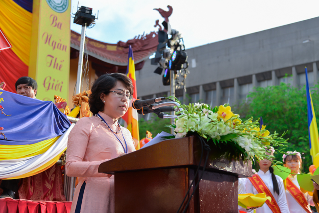 Qua đó, thay mặt lãnh đạo chính quyền TP.HCM phát biểu tại lễ đài, bà Tô Thị Bích Châu – Chủ tịch UBMTTQVN TP trân trọng kính chúc chư tôn giáo phẩm HĐCM, HĐTS, toàn thể Tăng Ni, Phật tử TP.HCM, trong và ngoài nước lời cầu chúc mạnh khỏe, an lạc trong mùa Phật đản. Bà nhấn mạnh: “Trong quá trình dựng nước và giữ nước hàng nghìn năm, lịch sử đã chứng minh trong các thời kỳ Phật giáo Việt Nam hưng thịnh luôn có sự gắn bó với Quốc gia, dân tộc và đã có những nhà sư, cũng như nam nữ Phật tử hiến thân phụng sự Đạo pháp, hy sinh thân mình để làm lợi ích cho đất nước, cho dân tộc. Đối với Đạo Phật, đạo và đời không tách rời nhau ‘Phật pháp bất ly thế gian giác”. Bà tin tưởng các Phật sự sắp tới, đặc biệt Đại hội đại biểu Phật giáo TP.HCM nhiệm kỳ 2017-2022 sẽ được chuẩn bị tốt… tạo nên sức mạnh, hiệu quả trong tổ chức và hoạt động của BTS GHPGVN TP là nhân tố quan trọng tạo nên sự vững mạnh và hiệu quả của GHPGVN.