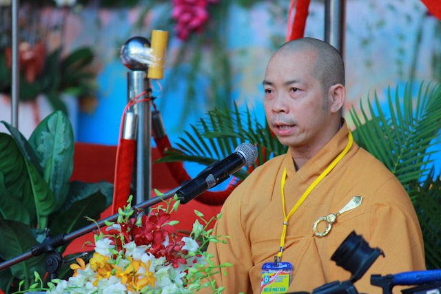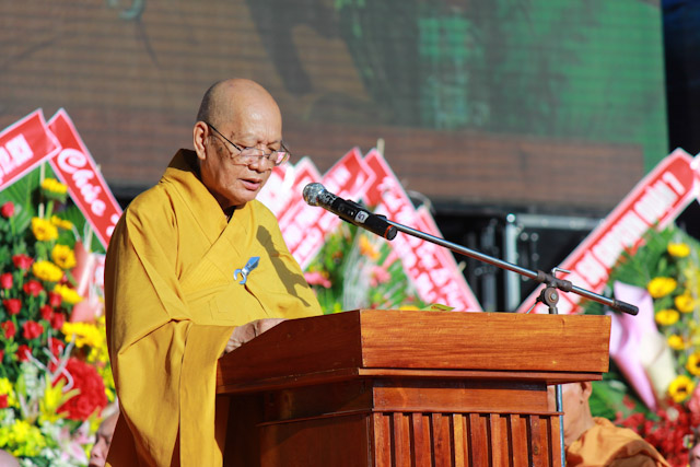 Tiếp đó là bài phát biểu khai mạc của HT. Thích Thiện Tánh, Phó Chủ tịch HĐTS, Trưởng ban Kiểm soát T.Ư, Phó Trưởng ban Thường trực BTS PG TP. HCM thay mặt TƯGH tuyên đọc Diễn văn Phật đản của Hoà thượng Chủ tịch HĐTS GHPGVN. Bài phát biểu nhấn mạnh: “Tưởng niệm ngày Đức Phật đản sinh PL.2559 trong bối cảnh thế giới vẫn xảy ra những xung đột, chiến tranh, hận thù, môi trường sinh thái khủng hoảng dẫn đến động đất, sóng thần, môi trường văn hóa xa rời tính nhân bản xuất phát từ lòng tham, sự sân hận, tâm si mê, thì hơn lúc nào hết chúng ta phải cùng nhau đi trên con đường cao thượng nhất là Bát chánh đạo, dưới ánh sáng cao thượng nhất là Tứ diệu đế mà trong bài pháp đầu tiên, kinh Chuyển Pháp luân, Đức Phật đã chỉ ra: “Từ bỏ hai cực đoan, Như Lai đã chứng ngộ Trung đạo, là con đường đem lại nhãn quan, tri kiến, đưa đến an tịnh, trí tuệ cao siêu, giác ngộ và Niết-bàn, đó là Bát chánh đạo”.”