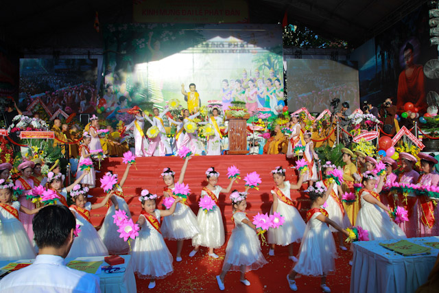 Sau phần nghi thức chào quốc kỳ, đạo kỳ và múa dâng hoa cúng dường của Phật tử đạo tràng Pháp Hoa là phần tuyên đọc thông điệp Phật đản PL 2559 của đức Pháp chủ gửi Tăng Ni và Phật tử Việt Nam trong và ngoài nước. Thông điệp có đoạn: “Vesak, ngày trăng tròn của tháng 4 linh thiêng theo lịch Ấn Độ diễn ra 3 sự kiện trùng hợp gắn với cuộc đời Đức Phật: Đức Phật đản sinh, Đức Phật thành Đạo, Đức Phật nhập Niết-bàn đã được Liên Hợp Quốc công nhận là lễ hội Phật giáo thế giới. Nhân dịp này, thay mặt toàn thể Tăng Ni, Phật tử Việt Nam, tôi gửi tới tất cả những người con Phật trên khắp hành tinh đón mừng mùa Vesak trong tình hữu nghị, hợp tác và phát triển vì hòa bình, thịnh vượng cho nhân loại.”