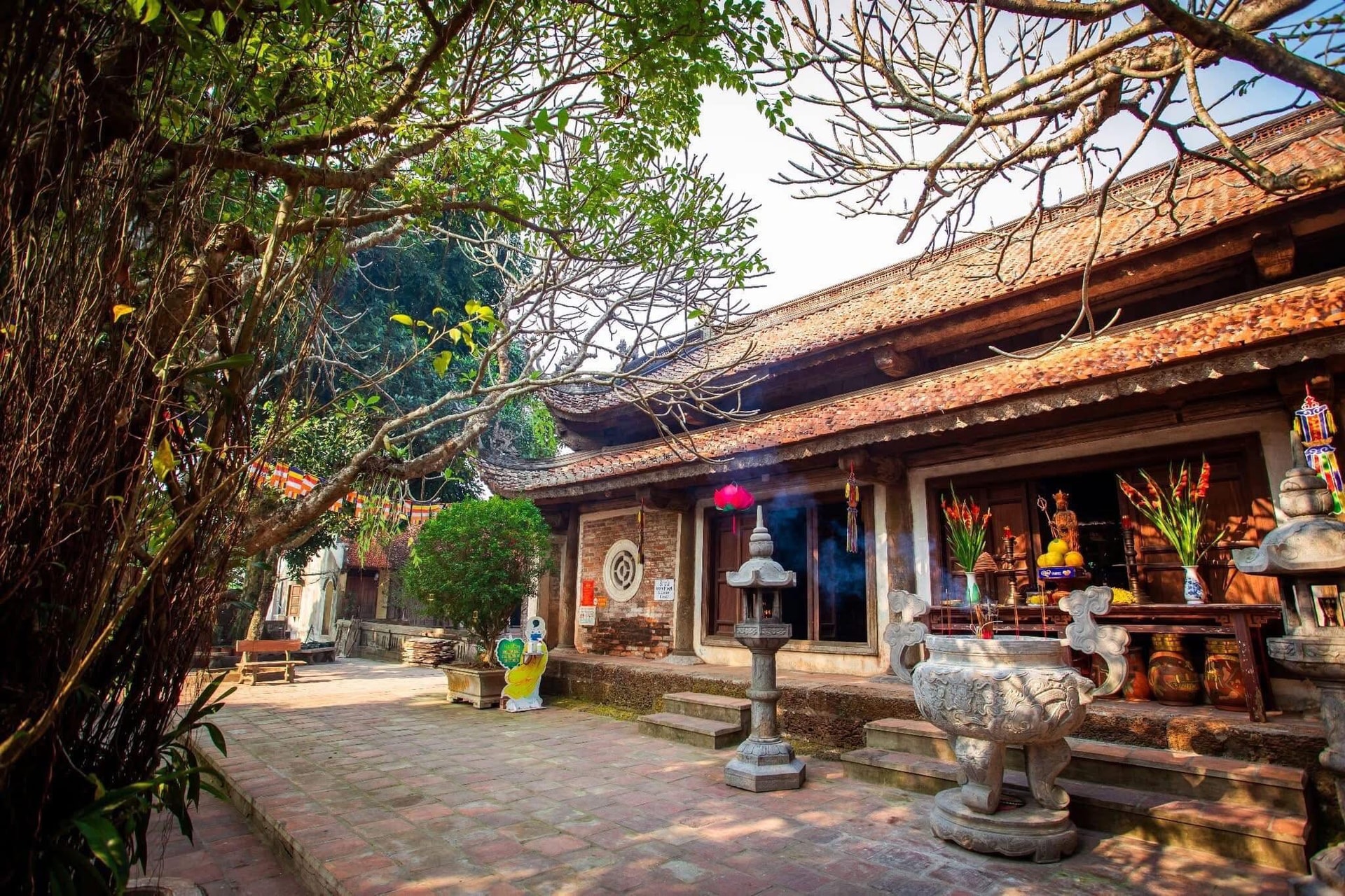 Để lên đến chùa, du khách phải vượt qua 239 bậc đá ong – đặc trưng của vùng đất Thạch Thất. Toàn bộ công trình sử dụng vật liệu truyền thống như gỗ lim, đá ong và gạch nung, tạo vẻ đẹp cổ kính, bề thế nhưng vẫn hài hòa với thiên nhiên. Đặc biệt, hệ thống mái chùa được thiết kế theo kiểu chồng diêm hai tầng tám mái, với các đầu đao cong vút, đậm nét kiến trúc cổ Việt Nam. Các cột và kèo chùa được chạm khắc tinh tế, thể hiện hoa văn rồng, phượng, họa tiết truyền thống, mang tính nghệ thuật cao.