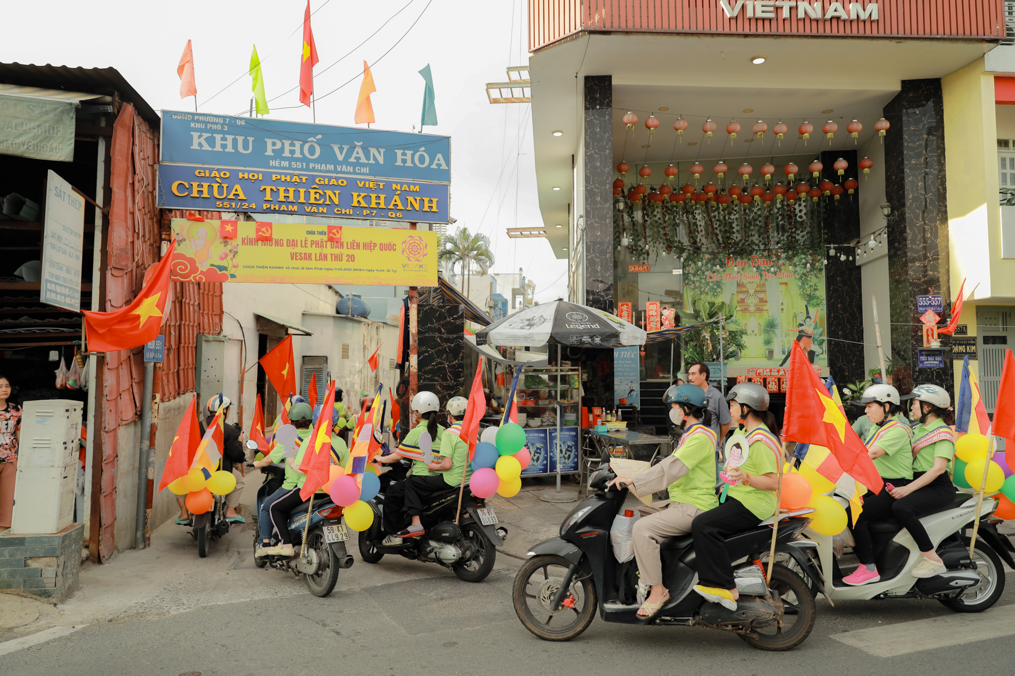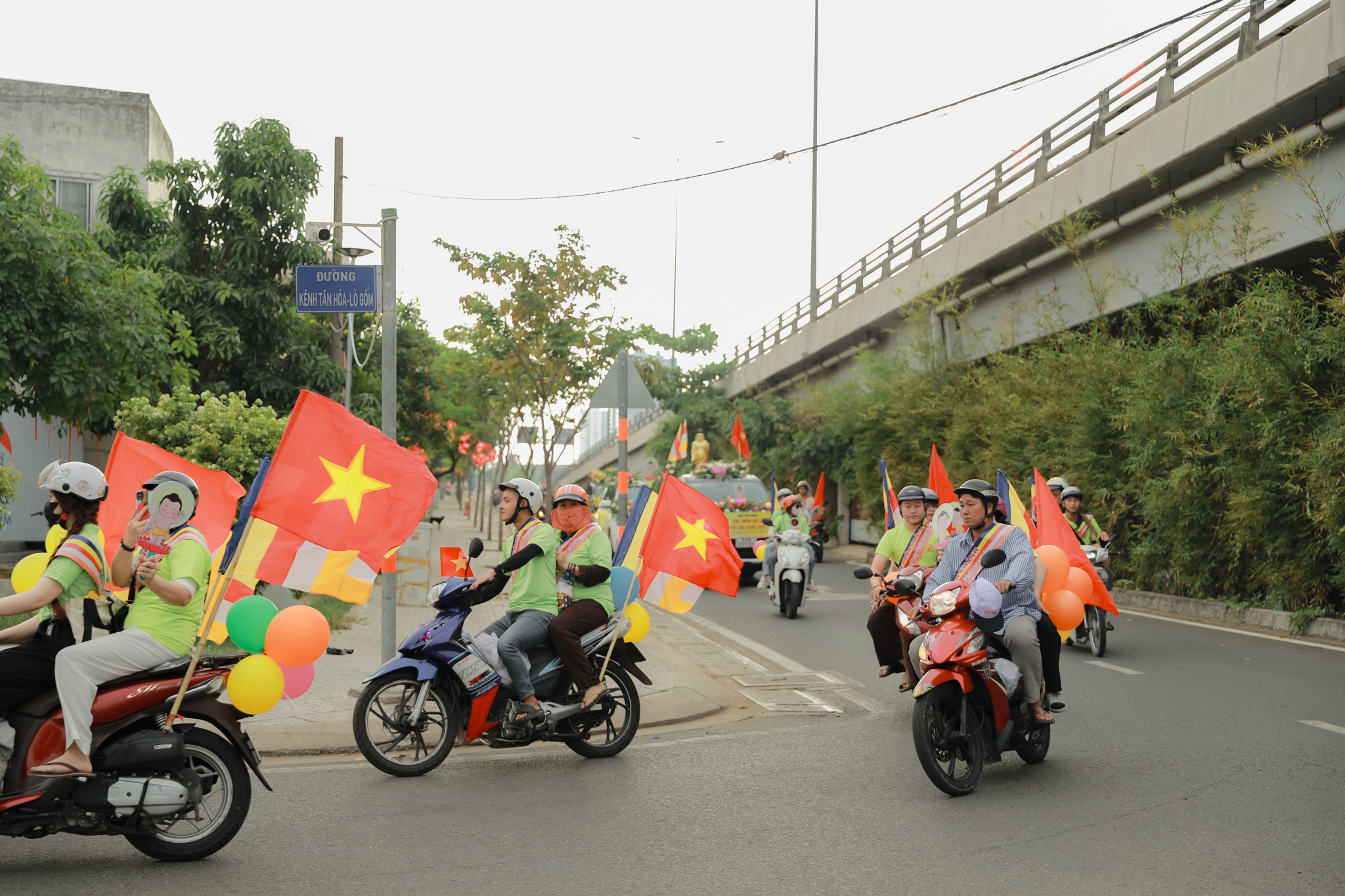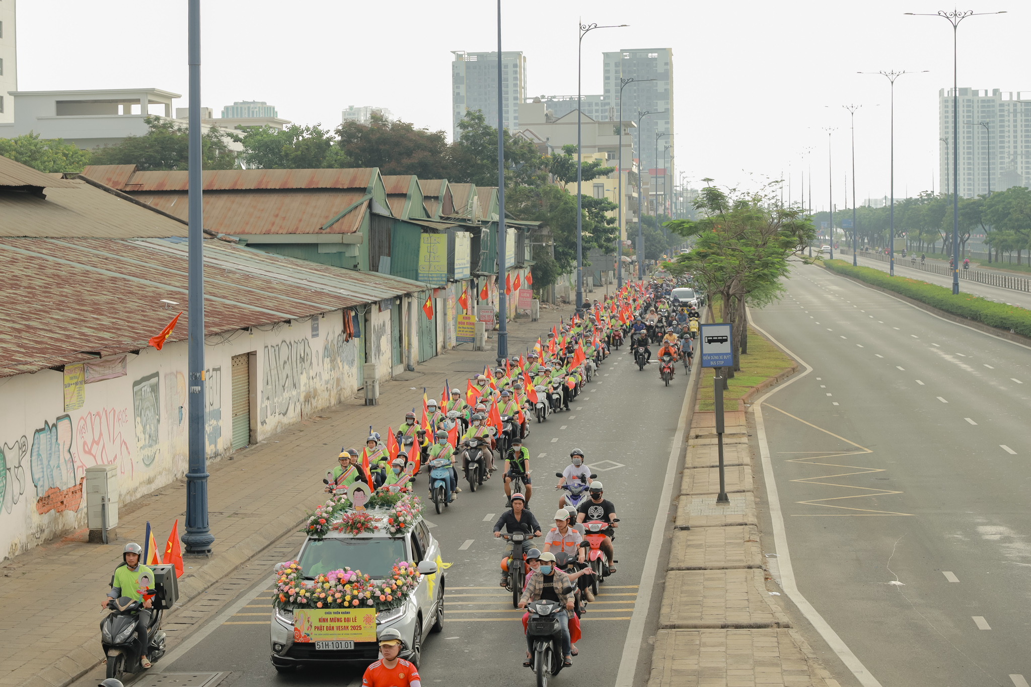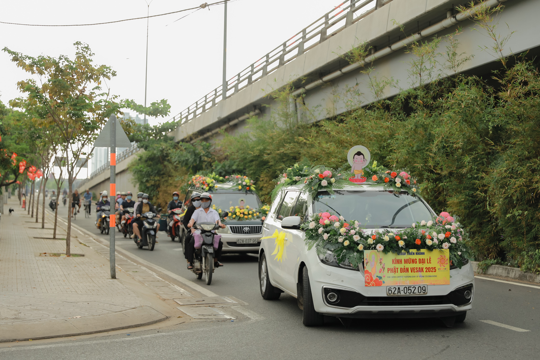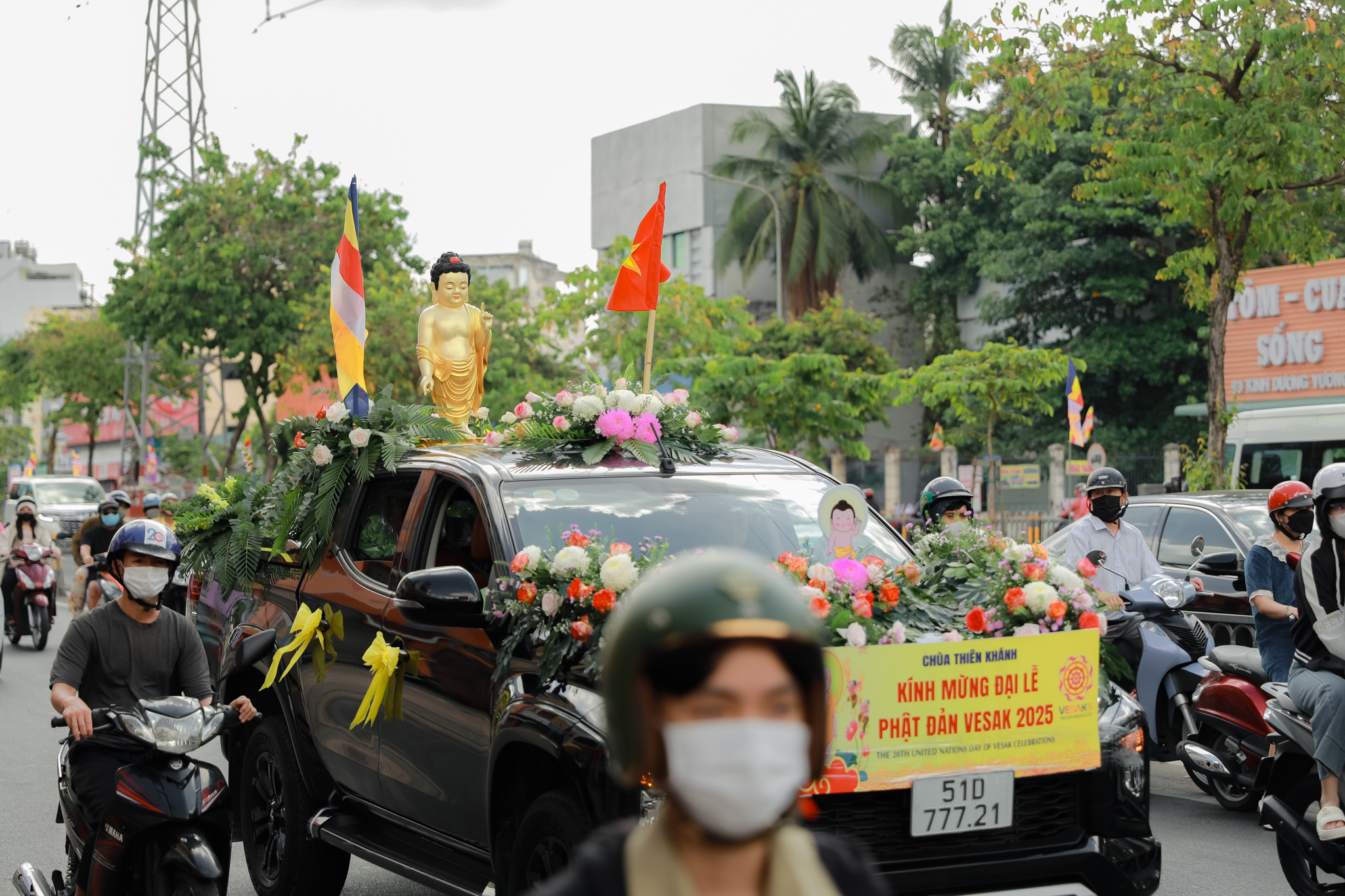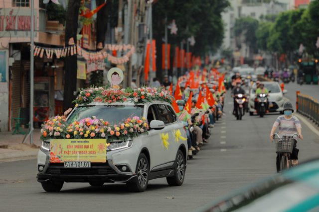 Đoàn xe hoa với biểu tượng Đức Phật sơ sinh, cờ Phật giáo và các khẩu hiệu ý nghĩa đã diễu hành qua nhiều tuyến đường chính của quận 6. Những bản nhạc mừng Khánh đản vang vọng suốt hành trình, lan tỏa tinh thần từ bi và giác ngộ.
