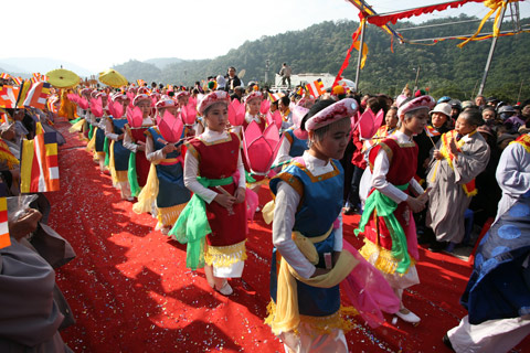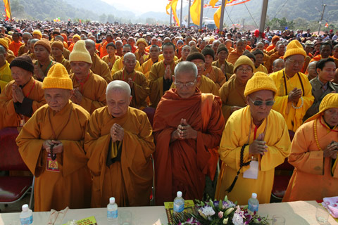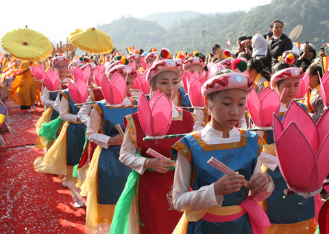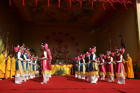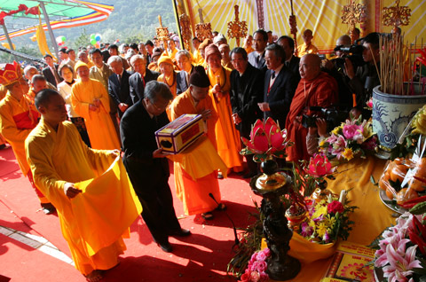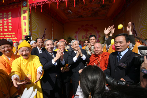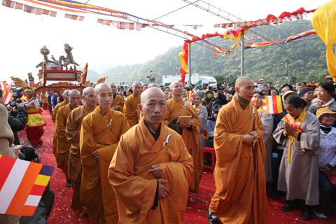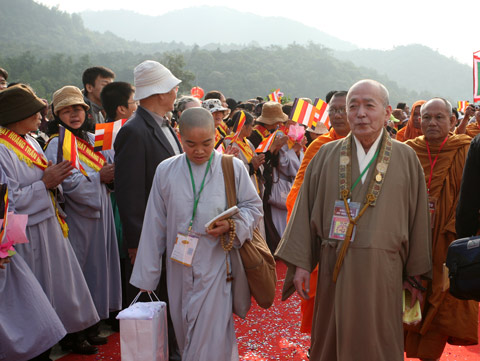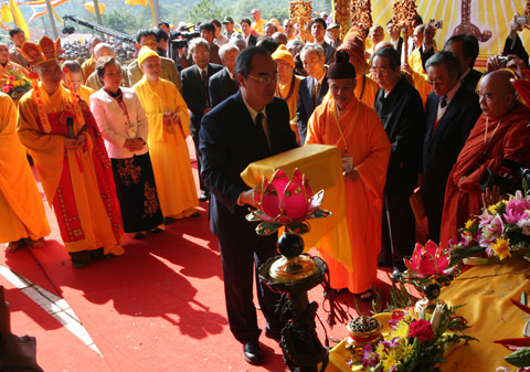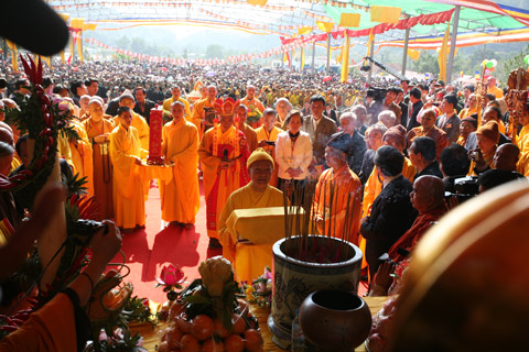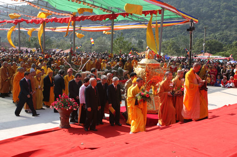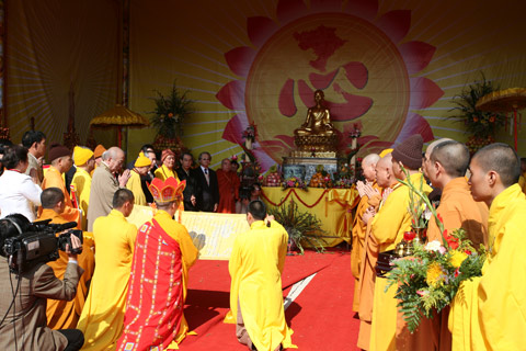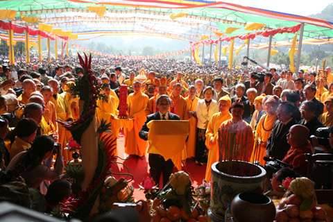 9h, đại lễ chính thức cử hành với nghi lễ chào cờ và chào đạo kỳ Phật giáo. Tham dự đại lễ có Chủ tịch Quốc hội Nguyễn Phú Trọng, nguyên Chủ tịch nước Trần Đức Lương, nguyên Chủ tịch Quốc hội Nguyễn Văn An, Phó Chủ tịch nước Nguyễn Thị Doan, Phó Thủ tướng Chính phủ Nguyễn Thiện Nhân, Phó pháp chủ Hội đồng chứng minh Giáo hội Phật giáo Việt Nam Hoà thượng Thích Thanh Sam.