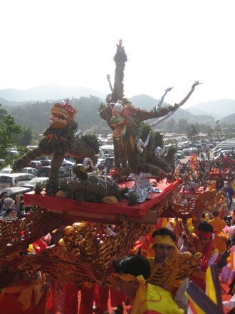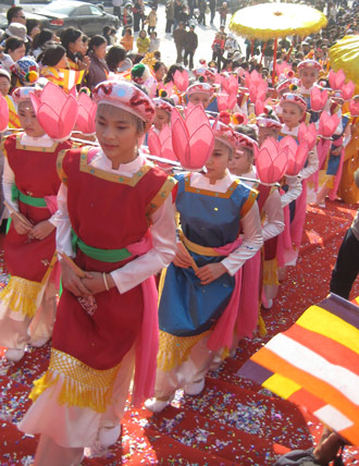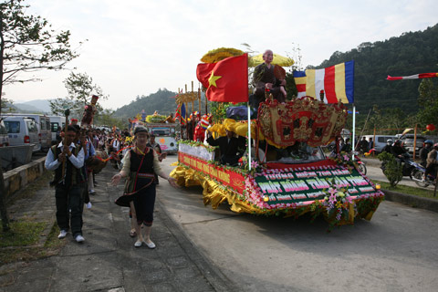 7h30 phút, đoàn xe hoa, lễ rước của tăng ni, phật tử thập phương, đồng bào các dân tộc tỉnh Quảng Ninh và dòng họ Trần Việt Nam, đại diện các đền thời Trần triều đã khởi hành từ chùa Trình tiến về quảng trường khai hội Yên Tử. Hai bên đường dẫn vào quảng trường khai hội rợp bóng đạo kỳ.