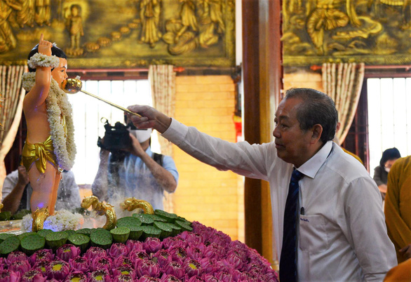 Phó thủ tướng Trương Hòa Bình thực hiện nghi thức tắm Phật – Ảnh: TIẾN LONG