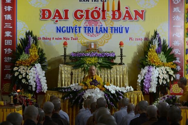 Căn cứ theo Giới đàn các nghi lễ được cử hành theo giới luật. Chư tôn đức hội đồng Giới sư quang lâm giới đàn, niêm hương bạch Phật cầu gia bị. Sau khi cung an chức sự hội đồng thập sư nhị bộ, quý vị Nghiệp sư của giới tử , đảnh lễ Hội đồng Giới sư. Tiếp đó, toàn thể các giới tử cầu thọ giới: Tỳ kheo, Tỳ Kheo Ni, Sa di, Sa di Ni , đảnh lễ Hội đồng Giới sư. Hòa thượng Đường đầu đã có lời giáo giới sách tấn các giới tử.
