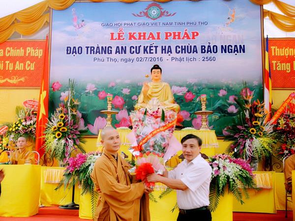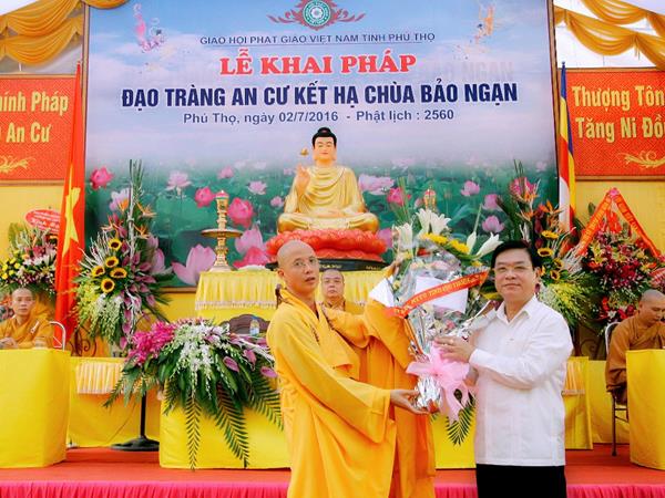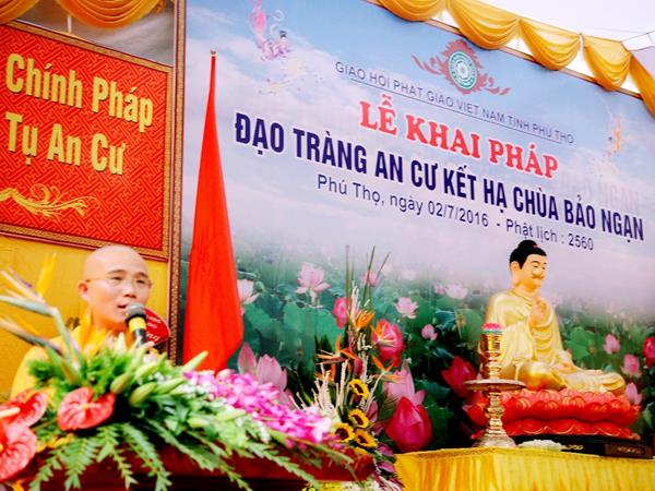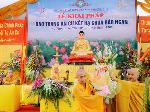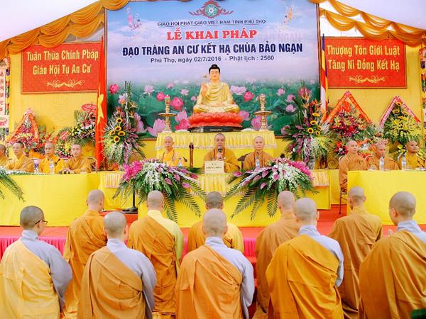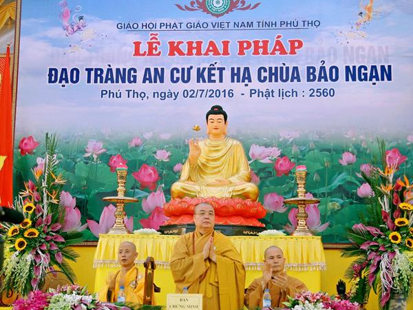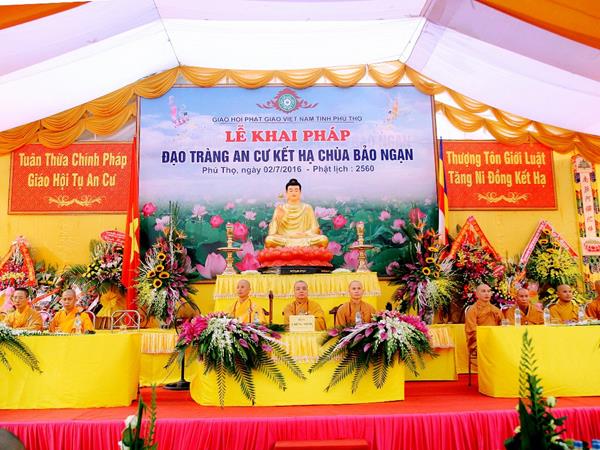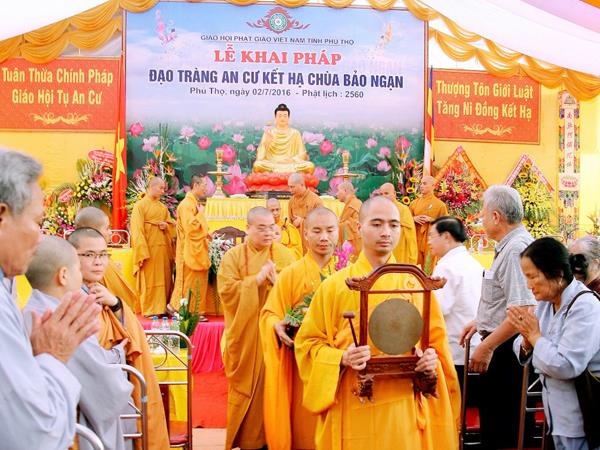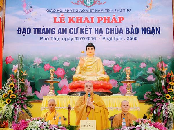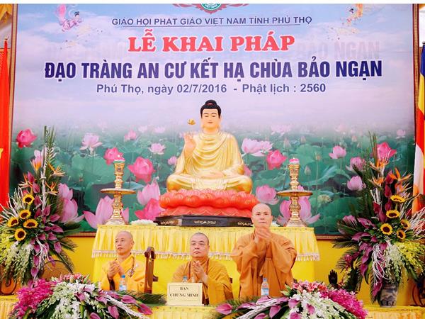 Sáng ngày 02/7/2016 tức ngày 28 tháng 5 năm Bính Thân, trường hạ chùa Bảo Ngạn đã long trọng tổ chức lễ khai pháp. Chứng minh buổi lễ, về phía giáo hội có Hòa thượng Thích Thanh Nhiễu, Phó Chủ tịch Thường trực Hội đồng Trị sự TW.GHPGVN – Hạ chủ trường hạ chùa Bảo Ngạn; Thượng tọa Thích Minh Nghiêm, Ủy viên HĐTS TW.GHPGVN, Trưởng BTS Phật giáo Việt Nam tỉnh Phú Thọ, Trưởng Ban Tổ chức khóa An cư Kết hạ năm 2016; Đại đức Thích Minh Thuận, Ủy viên dự khuyết HĐTS TW.GHPGVN, Phó Thường trực BTS Phật giáo Việt Nam tỉnh Phú Thọ, Chánh Duy na Hạ trường chùa Bảo Ngạn; sư thầy Thích Đàm Nhã – Ủy viên phân ban đặc trách Ni giới TWGHPGVN, Phó Trưởng BTS Phật giáo Việt Nam tỉnh Phú Thọ; chư tôn đức thường trực BTS GHPGVN tỉnh Phú Thọ; cùng 84 hành giả an cư của hạ trường.