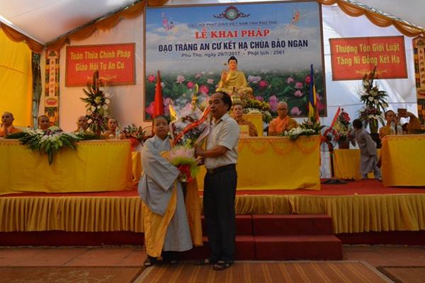 An cư kiết hạ là sự kiện trọng đại của Tăng ni Phật giáo. Quý vị đại biểu chính quyền đến tham dự tặng hoa chúc mừng trên tinh thần đạo pháp và dân tộc. Tại buổi lễ ông Nguyễn Văn Ngọc đại diện quý vị đại biểu đã ghi nhận sự đóng góp Tăng Ni trên tinh thần đại đoàn kết toàn dân, chúc quý vị 3 tháng an cư vô lượng pháp lạc, chuẩn bị một hành trang vững chắc sau 3 tháng an cư đồng hành cùng Mặt trận trong tinh thần đại đoàn kết toàn dân. ĐĐ. Thích Minh Thuận thay lời HT đường chủ ban đạo từ sách tấn toàn thể hành giả an cư, khuyến tiến các Phật tử tu tập . Buổi lễ kết thúc trong không khí trang nghiêm với bữa cơm chay thanh đạm với niềm hoan hỷ vô biên.
