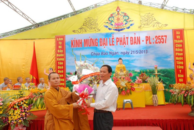 Buổi lễ đón nhận nhiều lẵng hoa, quà chúc mừng từ chính quyền tỉnh, thành phố, địa phương và các chùa lân cận.