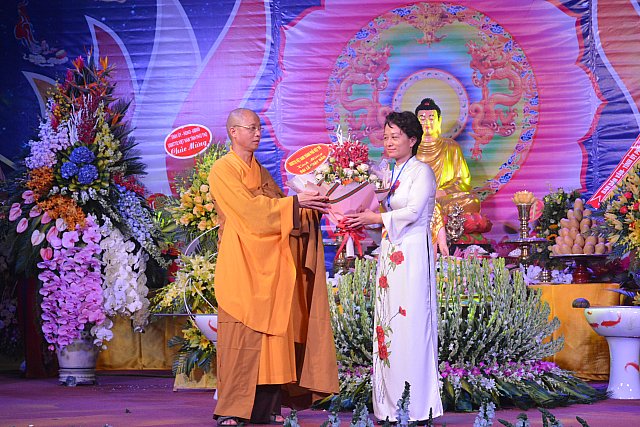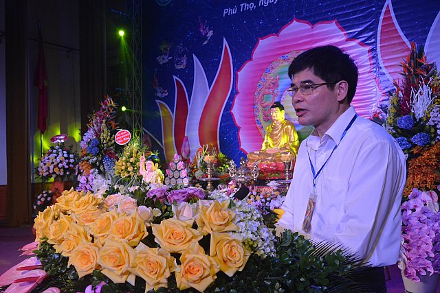 Nhân ngày lễ trọng của Phật giáo đại diện đại biểu lãnh đạo chính quyền Ông Dương Hoàng Hương – Ủy viên Ban Thường vụ Tỉnh ủy, chủ tịch UBMTTQVN tỉnh Phú Thọ đã có lời chúc mừng đến với các chức sắc tôn giáo cùng Phật giáo đồ. Ông cũng đã thay lời tỉnh ủy ghi nhận Phật giáo Việt Nam đã tổ chức thành công đại lễ Vesak tại Hà Nam điều đó đã khẳng định thêm được vị trí Phật giáo trong lòng dân tộc Việt. Bên cạnh đó Phật giáo Phú Thọ đã thể hiện đầy đủ hoạt dộng đích thực về an sinh xã hội, Quý Tăng Ni trong tỉnh Phú Thọ đã hoằng pháp mang tinh thần yêu nước, đoàn kết, cứu khổ, cứu sinh thể hiện tinh thần nhân đạo. Người con Phật đã phát huy tinh thần từ bi Trí tuệ thể hiện tốt việc tương thân tương ái, tiếp tục tuyên truyền những chính sách của Đảng, nhà nước đồng hành với sụ nghiệp đại đoàn kết toàn dân trên tinh thần Đạo pháp – Dân tộc – Chủ nghĩa Xã hội. Mong rằng chư Tăng Ni Phật tử tiếp tục phát huy những tinh thần trên, phát huy những thành tích đã đạt được, khuyến tiến bà con nhân dân Phật tử luôn thực hiện tốt chính sách chủ trương của đảng tránh những thế lực thù địch trong xã hội… Chúc đại lễ thành công viên mãn. Về tham dự đại lễ thay mặt thường vụ tỉnh ủy, Ban chỉ đạo Công tác Tôn giáo tỉnh Phú Thọ Bà Nguyễn Thị Thanh Huyền – Ủy viên Ban Thường vụ Tỉnh ủy, Phó trưởng ban Thường trực Ban chỉ đạo Công tác Tôn giáo tỉnh Phú Thọ, trưởng Ban Dân vận Tỉnh ủy tỉnh Phú Thọ đã có lẵng hoa chúc mừng.