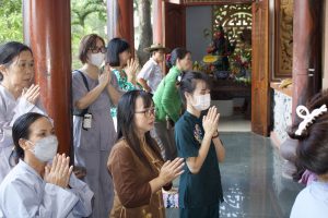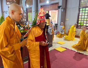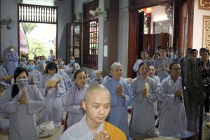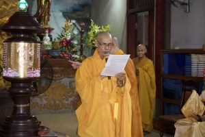 Trong không khí hân hoan, thành kính đón mừng Phật đản, chư Tôn Đức Tăng và toàn thể hội chúng tiến hành nghi lễ niêm hương bạch Phật, tụng kinh và hồi hướng cầu nguyện quốc thới dân an, chúng sinh an lạc.