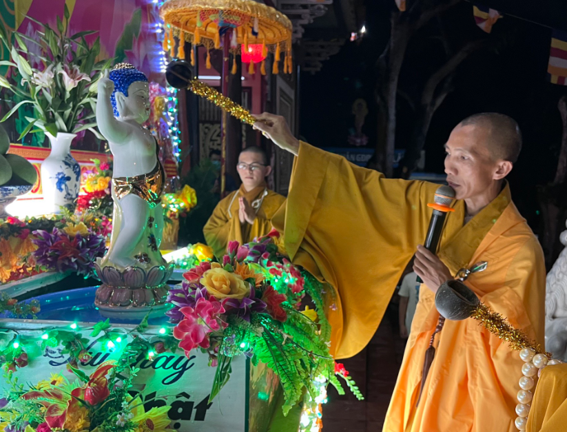 Tại buổi lễ, sau khi thực hiện các nghi lễ truyền thống lễ tắm Phật, Đại đức Thích Quảng Bá có thời chia sẻ pháp đàm về ý nghĩa của lễ tắm Phật.