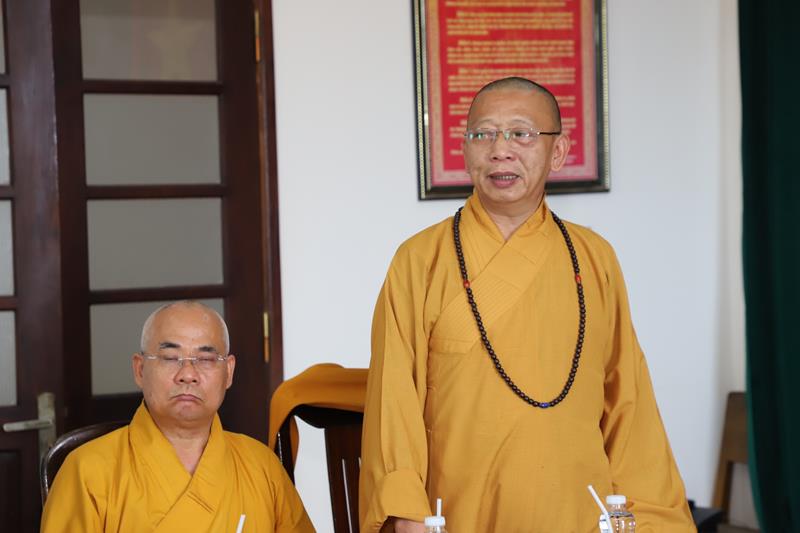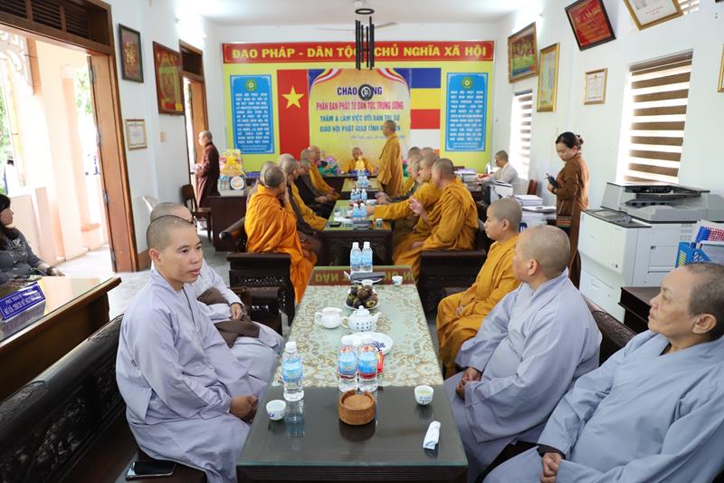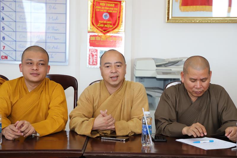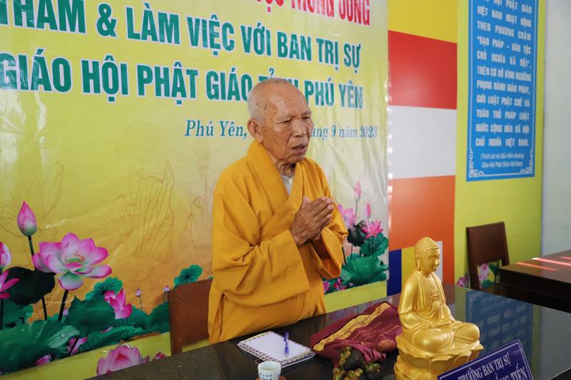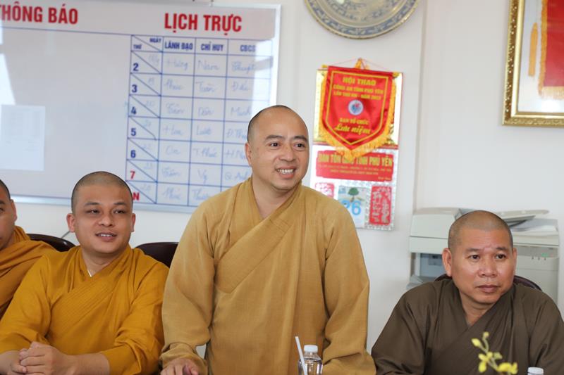 Thay mặt Ban Trị sự GHPGVN tỉnh Phú Yên, HT.Thích Đồng Tiến – Ủy viên HĐTS, Trưởng Ban Trị sự GHPGVN tỉnh đã phát biểu chào mừng bày tỏ niềm hoan hỷ được cung đón chư Tôn đức phái đoàn đã thân lâm tới thăm và làm việc tại Ban Trị sự GHPGVN tỉnh. Hoà thượng cũng cho biết, tỉnh Phú Yên có 09 huyện, thị xã, thành phố, trong đó có 3 huyện miền núi người đồng bào dân tộc chiếm phần đa số (huyện Sông Hinh, huyện Sơn Hoà, huyện Đồng Xuân) vì điều kiện khách quan về mặt địa lý, kinh tế, Phật giáo chỉ mới bắt đầu phát triển trong thời gian gần đây. Hoà thượng cũng mong muốn chư Tăng, Ni có trình độ Phật học và đạo hạnh dấng thân hoằng pháp đến những vùng miền núi xa xôi trên tinh thần vô ngã, vị tha của Phật giáo. Đặc biệt, Ban Trị sự cũng như các ban, nghành luôn luôn quan tâm và hỗ trợ đến Phân Ban hướng dẫn Phật tử dân tộc tỉnh trong mọi công tác Phật sự nhằm mang giáo lý Phật đà đến với đồng bào, dân tộc.