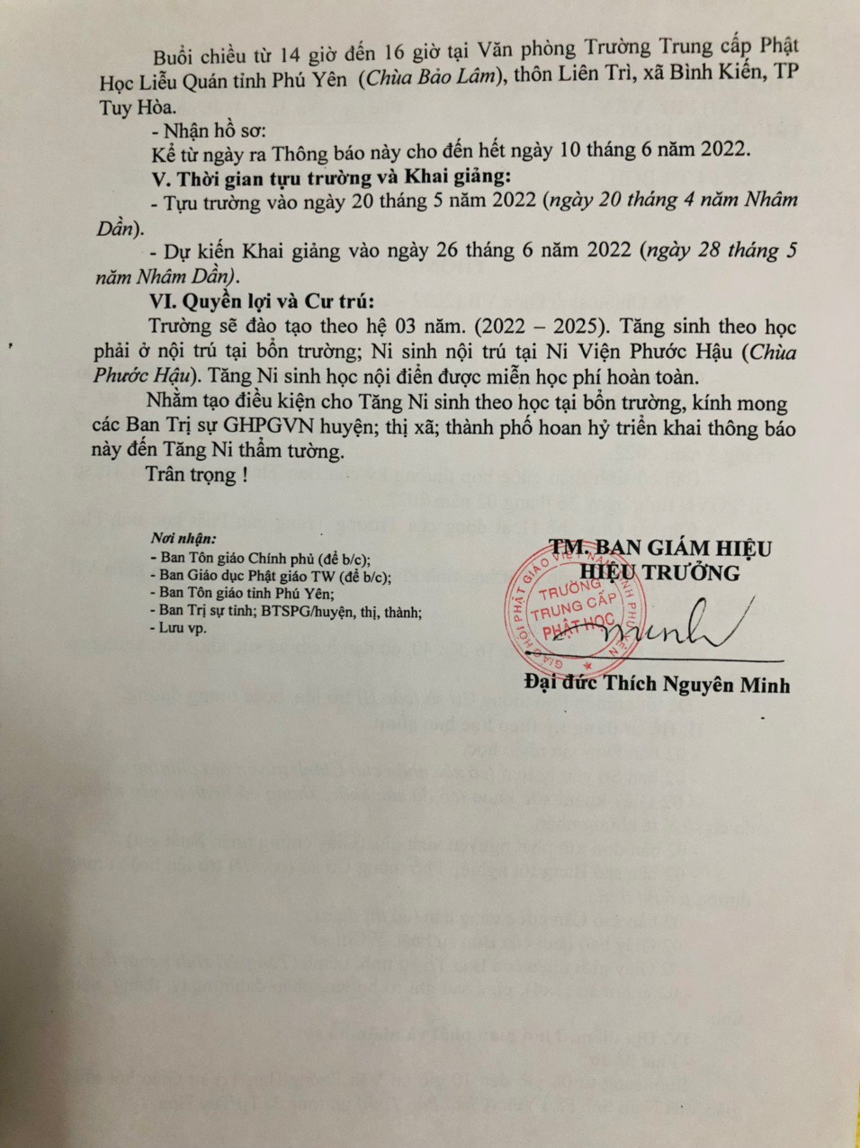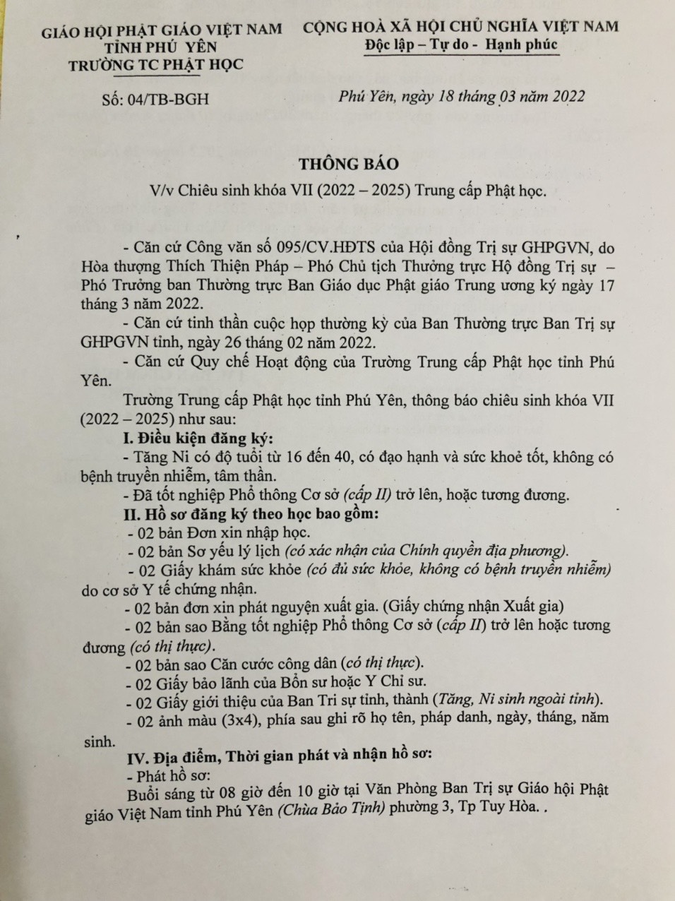 Trang chủ Tin tức Thông báo Phú Yên: Tuyển sinh Trung cấp Phật học Khóa VII (2022 –... Tin tứcThông báo Phú Yên: Tuyển sinh Trung cấp Phật học Khóa VII (2022 – 2025) Bởi Thường trực BBT - 16 Tháng Tư, 2022 Facebook Twitter Google+ Pinterest WhatsApp Email Print Viber Ban Giám hiệu Trường Trung cấp Phật học Liễu Quán tỉnh Phú Yên thông báo Tuyển sinh Khóa VII (2022 – 2025). Xem chi tiết thông báo văn bản phía dưới PGPY