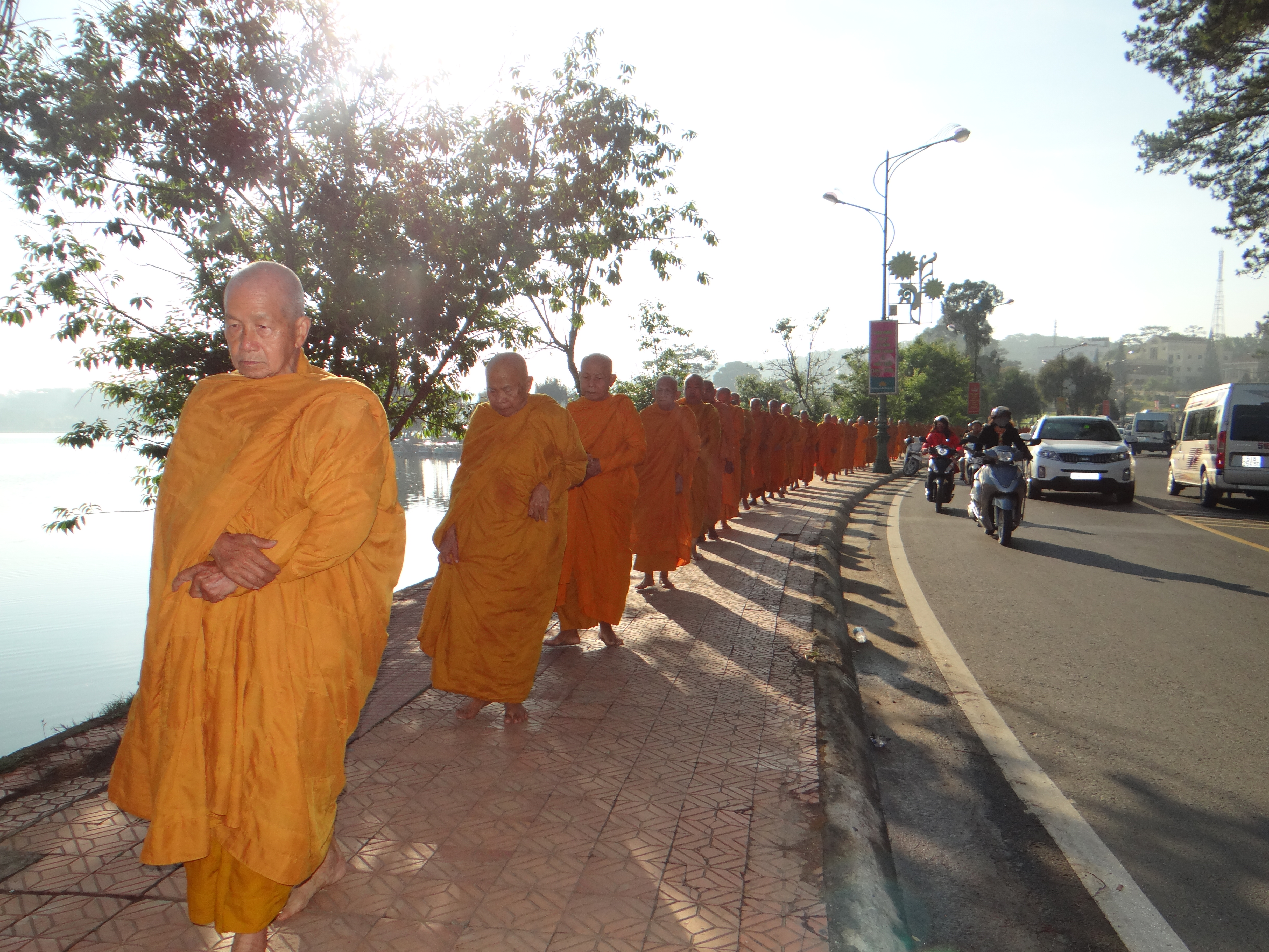 Nằm trong khuôn khổ của khóa tu truyền thống Hệ phái Khất sĩ lần thứ 28 . Sáng nay, 8/4 , 128 chư tôn đức hành giả đến từ 6 giáo đoàn trên cả nước đã thực hiện pháp tu trì bình khất thực tại hồ Xuân Hương Tp Hoa ĐàLạt . Hành trình được khởi phát từ nhà Thủy Tạ và kết thúc tại bến du thuyền Thanh Thủy, hàng trăm phật tử và du khách đứng trang nghiêm hai bên đường, thành kính dâng lễ vật cúng dường .