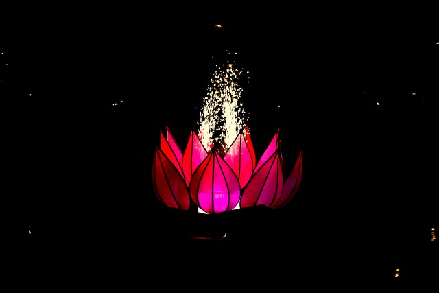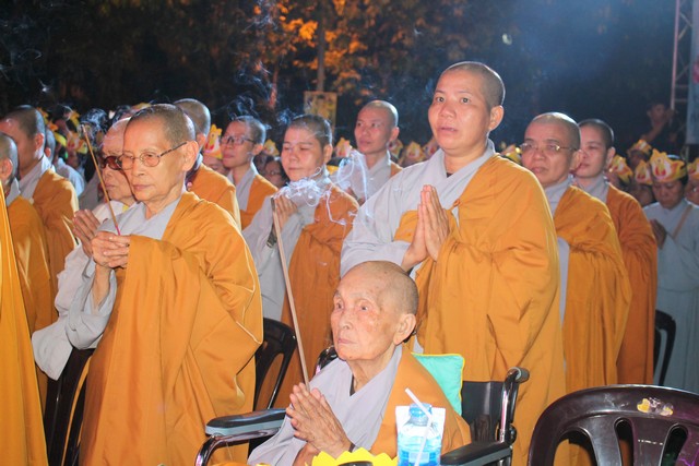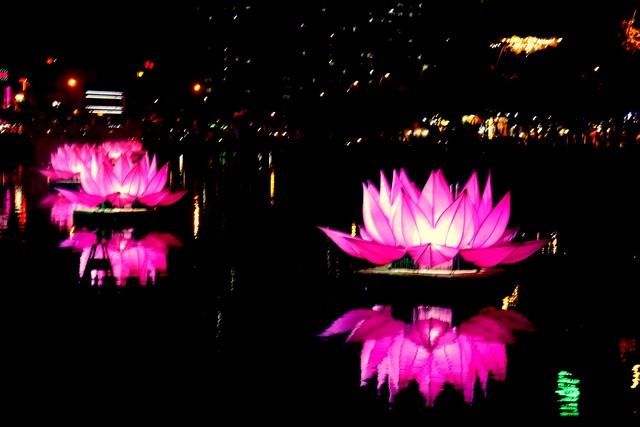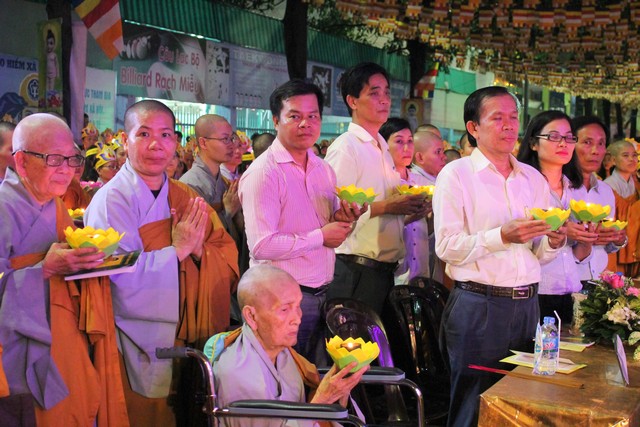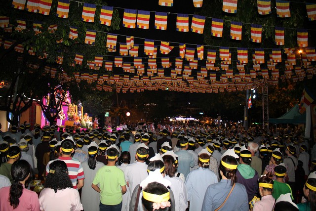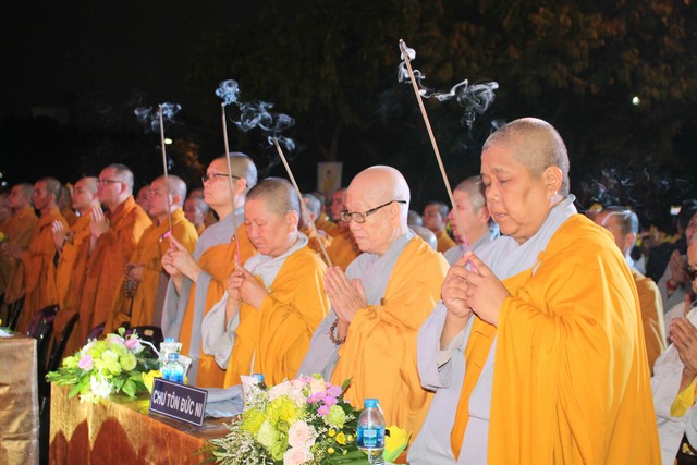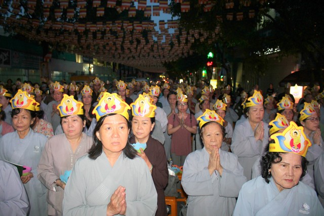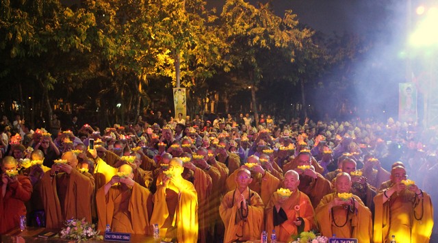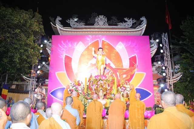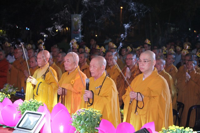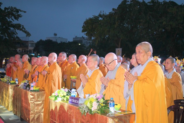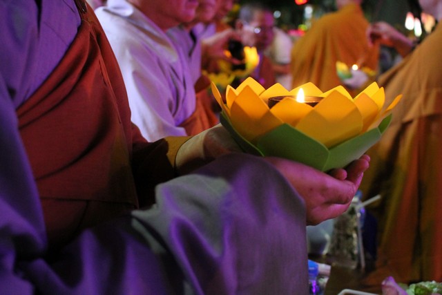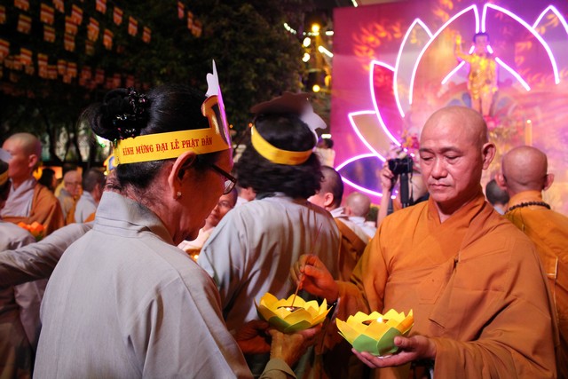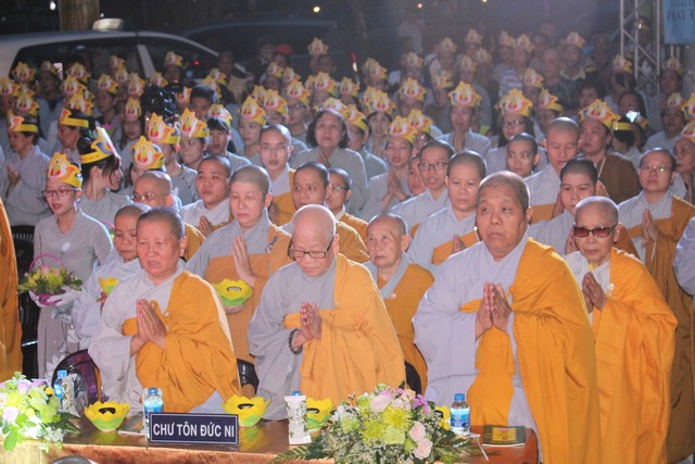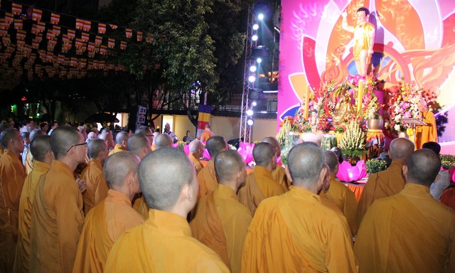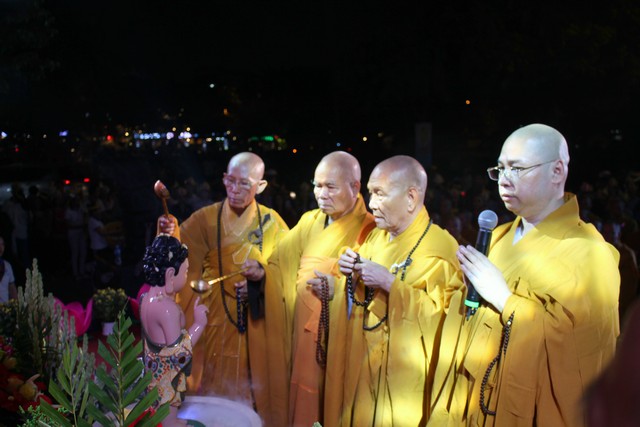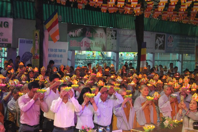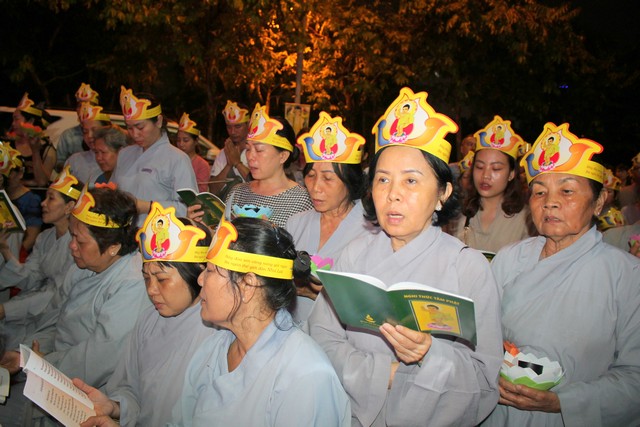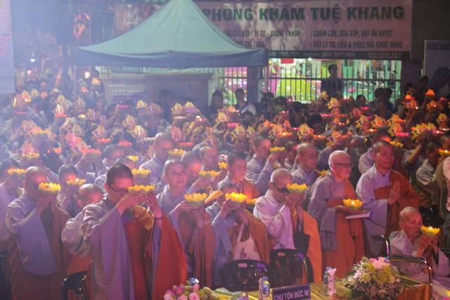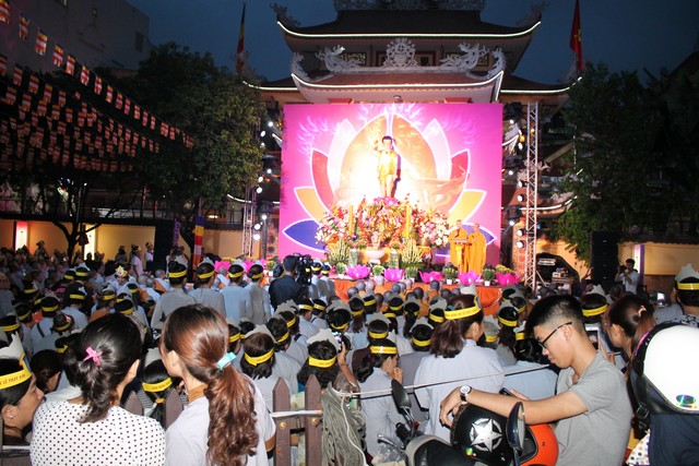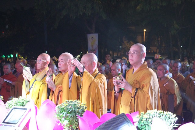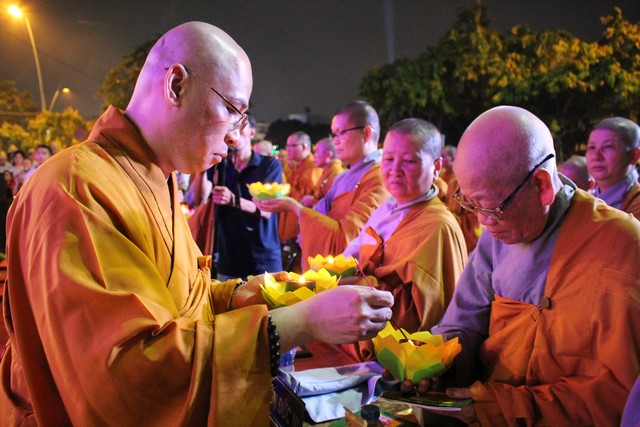 Sau nghi lễ dâng hương hoa, khai kinh, tắm Phật, truyền đăng, tứ chúng vân tập tại bờ kênh Nhiêu Lộc cử hành thắp sáng bảy đóa sen hồng.