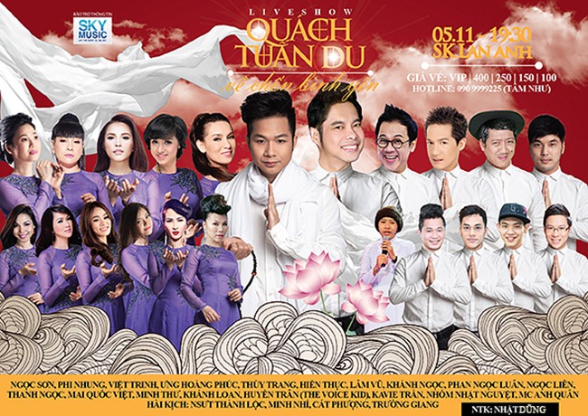 Theo đó, liveshow diễn ra lúc 19h30 ngày 5/11 tại sân khấu Lan Anh (TP HCM) sẽ gồm 3 phần chính, với những câu chuyện về hành trình của một đời người. Trong đó, Quách Tuấn Du và các khách mời lần lượt thể hiện những bài hát nổi tiếng, được nhiều phật tử yêu thích như: Biết bao giờ, Ca ngợi Đấng Thế Tôn, Tiếng chuông khuya, Việt Nam Phật giáo sáng ngời . . . Dàn khách mời “tên tuổi”, gồm ca sĩ Ngọc Sơn, Phi Nhung, Việt Trinh, Hiền Thục, Ưng Hoàng Phúc, Khánh Ngọc, Ngọc Liên, Minh Thư, Mai Quốc Việt, bé Huyền Trân… và cả các nghệ sĩ Thành Lộc, Minh Nhí, Cát Phượng, Trường Giang.