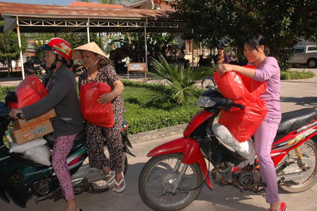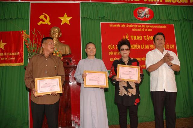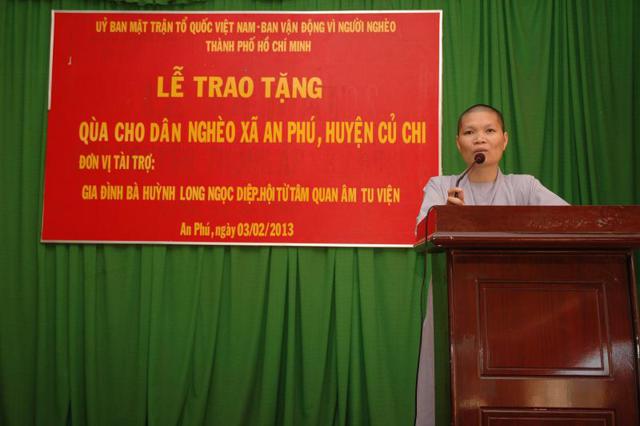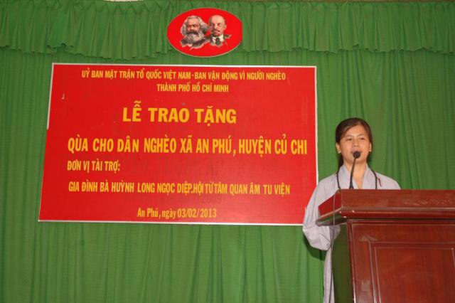 Được biết, 150 phần qùa tết đã được trao tặng tại Ủy ban nhân dân xã An Phú gồm có 6 ấp (Xóm Thuốc – Xóm Chùa – Phú Trung – Phú Bình – An Hòa – An Bình), ngoài ra – tại cơ sở may Pháp Phục Lam Hiền trao tặng 150 phần qùa cho bà con nghèo thuộc Đạo tràng Đại bi Lam Hiền.